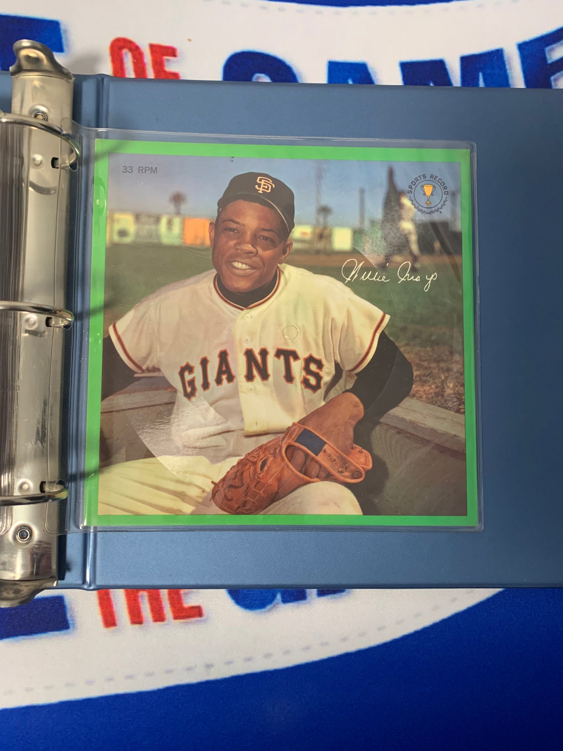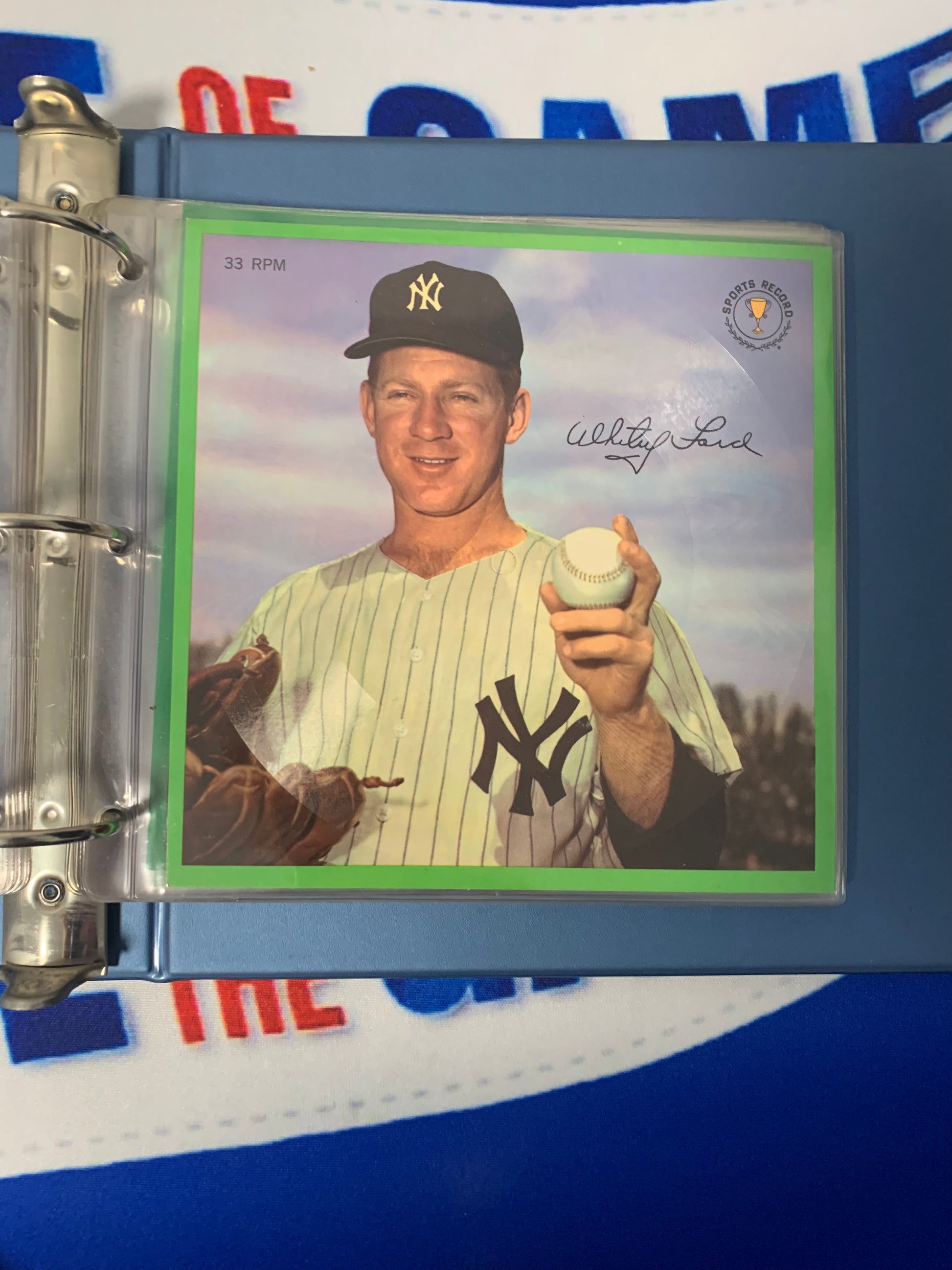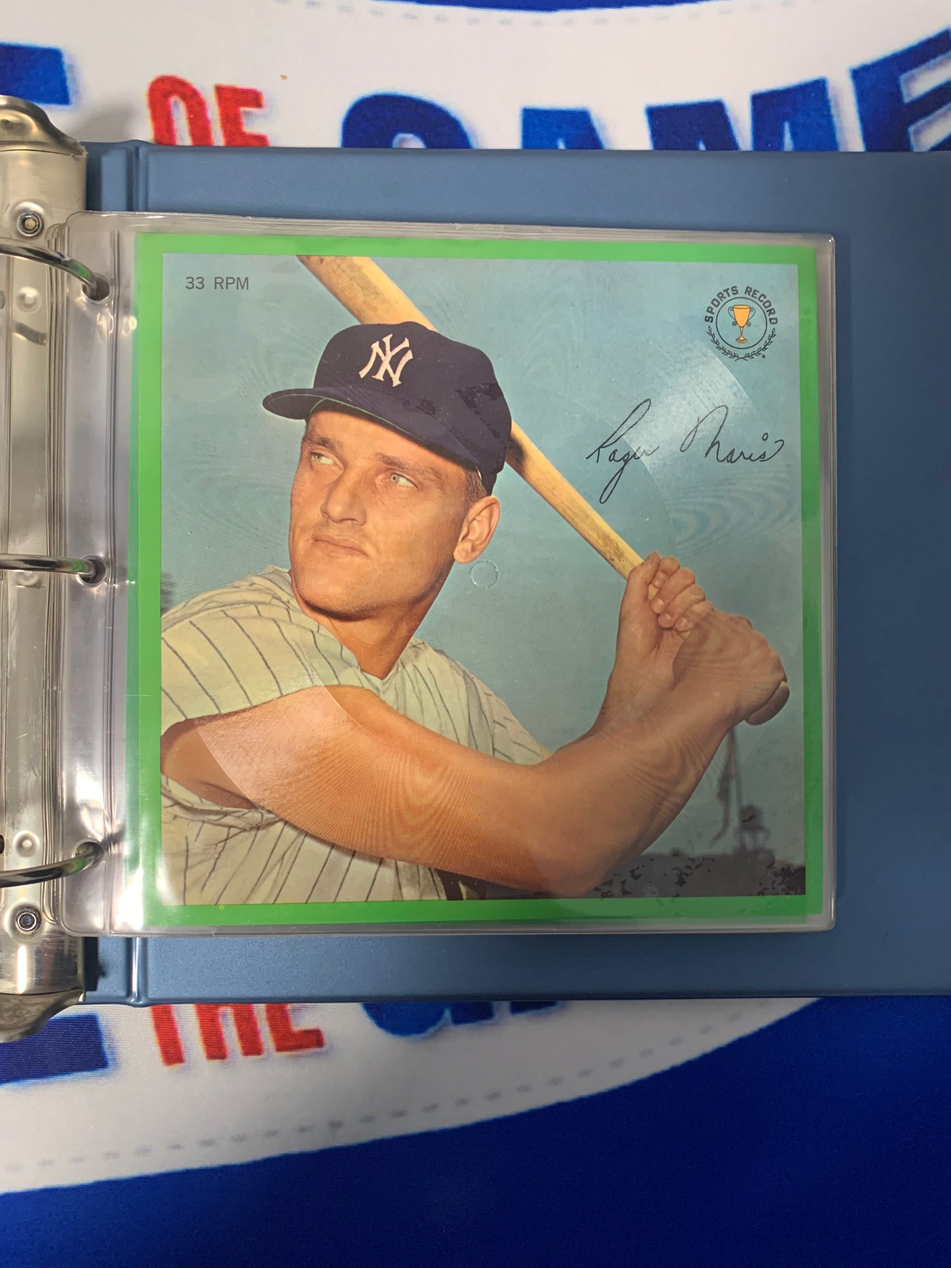 1964 Complete set of Columbia Sports Champions paperboard records with holes unpunched. Like-new, excellent condition records telling the stories of Mickey Mantle, Roger Maris, Whitey Ford, Don Drysdale, Sandy Koufax, Ernie Banks, Warren Spahn, Willie Mays, Al Kaline, Rocky Colavito, Jim Gentile, Ken Boyer, Bill Mazeroski, Bob Allison, Frank Robinson, and Pete Ward. Each record features a full-color photo on the front with player histories and stats on the reverse.