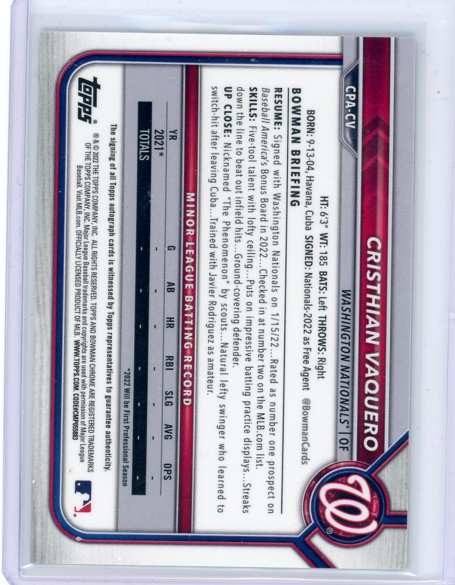 Cristhian Vaquero 2022 Bowman Chrome #CPA-CV 1st Bowman Prospect Auto