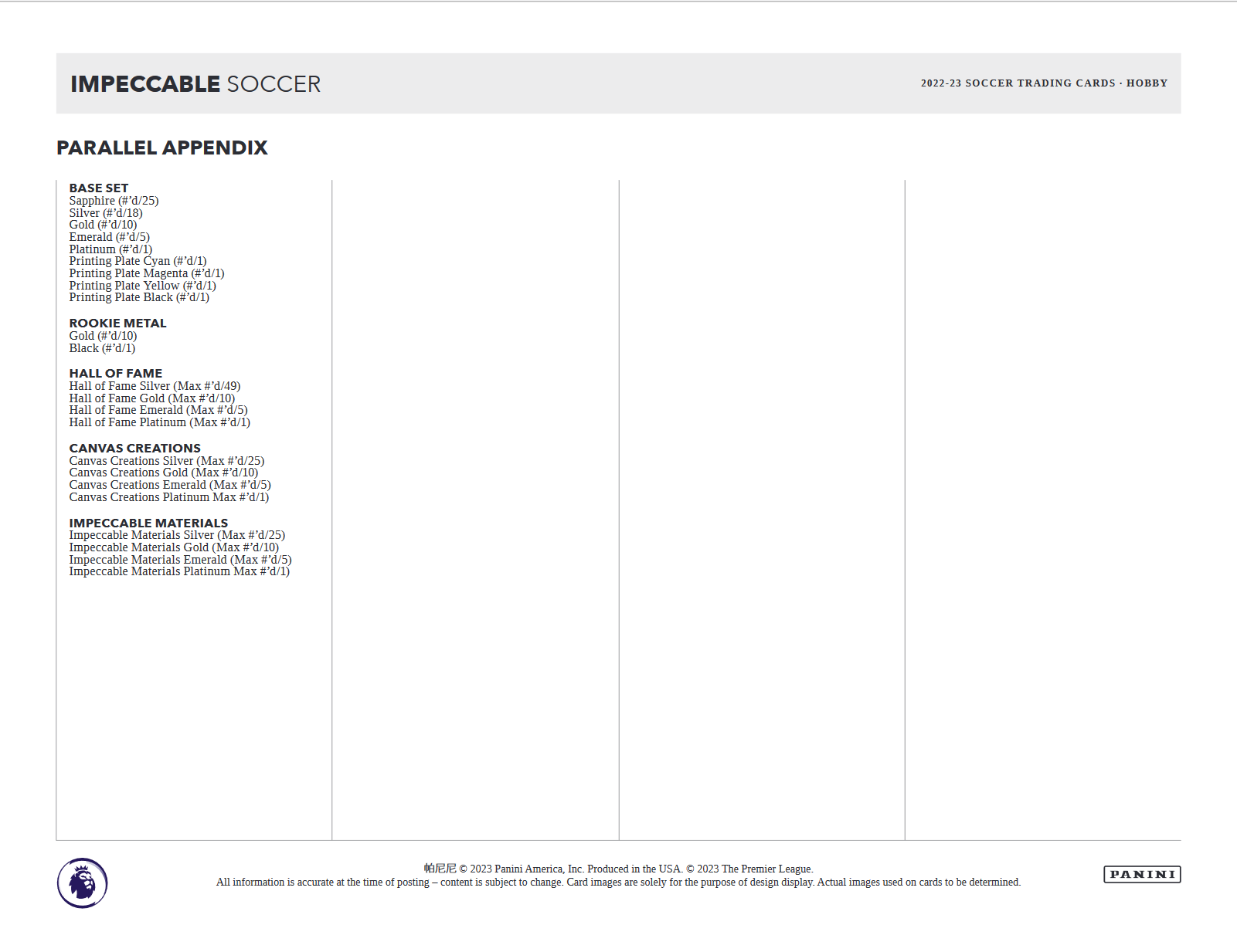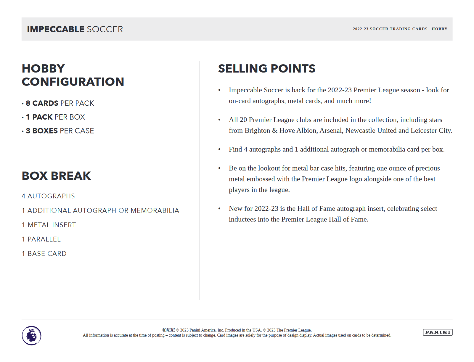 - Impeccable Soccer is back for the 2022-23 Premier League season - look for on-card autographs, metal cards, and much more!