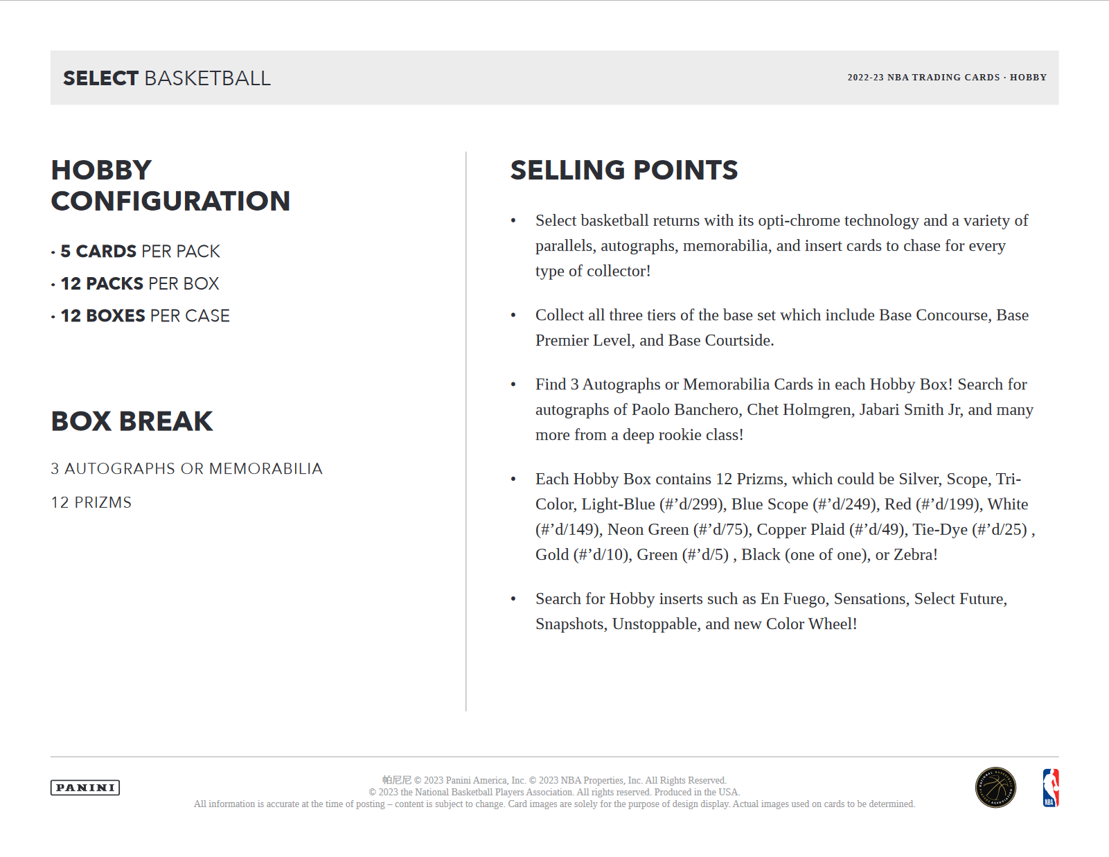 - Select basketball returns with its opti-chrome technology and a variety of parallels, autographs, memorabilia, and insert cards to chase for every type of collector!