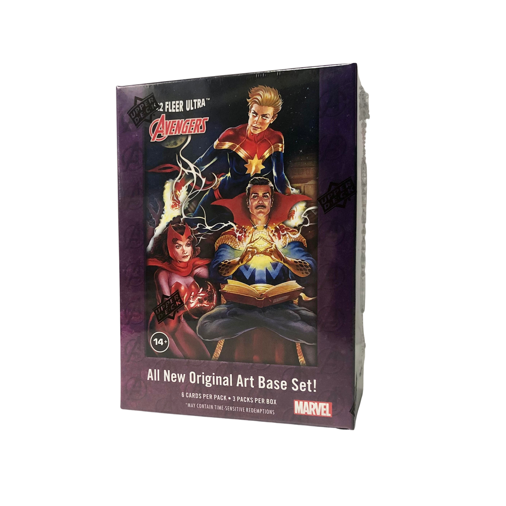 2022 Marvel Fleer Ultra Avengers Trading Card Blasters offer premium all-new original art from top artists! Collect retro Fleer Ultra designs, exclusive content, technology cards, and new inserts! Look for Blaster Exclusive Ultra Stars Cards! Featuring an All New Original Art 90 Card Base Set and 15 Card Silver Age Base Set!