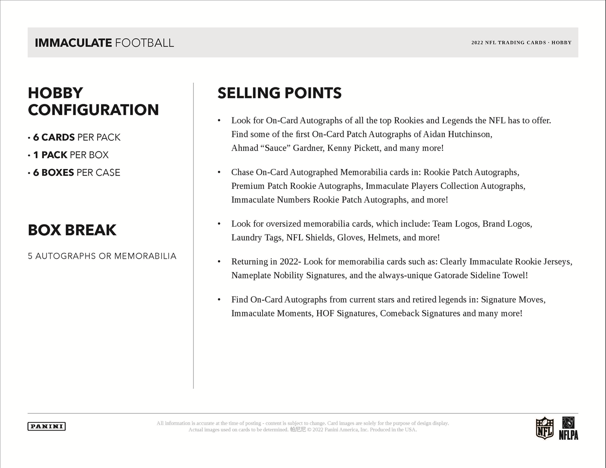 - Returning in 2022 Immaculate Collection- Chase the 1/1 Dual NFL Shield Signatures, featuring On-Card Autographs of iconic pairs of NFL stars!