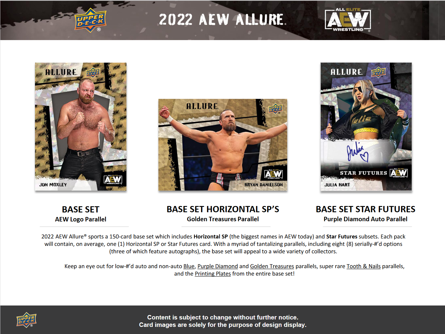 - 2022 AEW Allure® sports a 150-card base set which includes 25 Horizontal SP cards (the biggest names in AEW today) and 25 Star Futures cards.