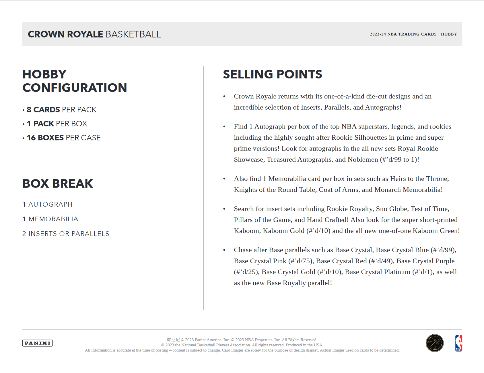 - Crown Royale returns with its one-of-a-kind die-cut designs and an incredible selection of Inserts, Parallels, and Autographs!