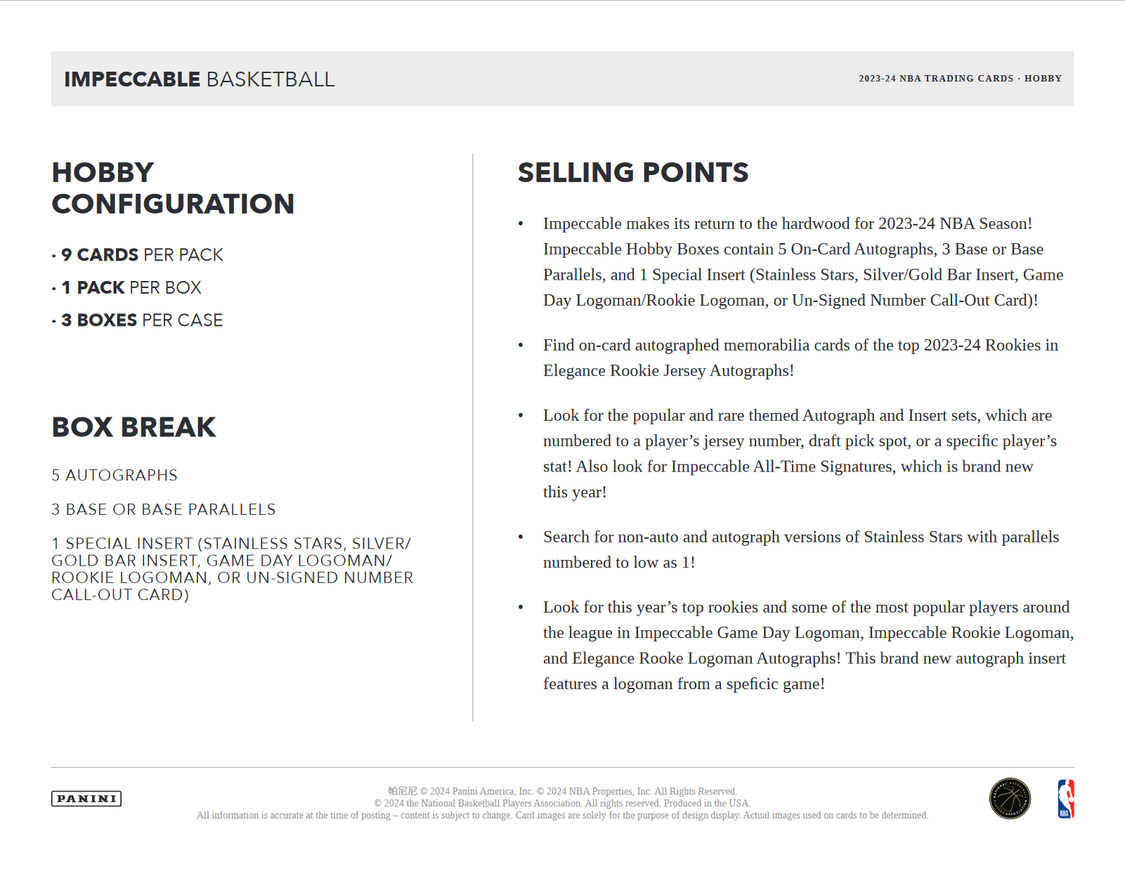 - Impeccable makes its return to the hardwood for 2023-24 NBA Season! Impeccable Hobby Boxes contain 5 On-Card Autographs, 3 Base or Base Parallels, and 1 Special Insert (Stainless Stars, Silver/Gold Bar Insert, Game Day Logoman/Rookie Logoman, or Un-Signed Number Call-Out Card)!