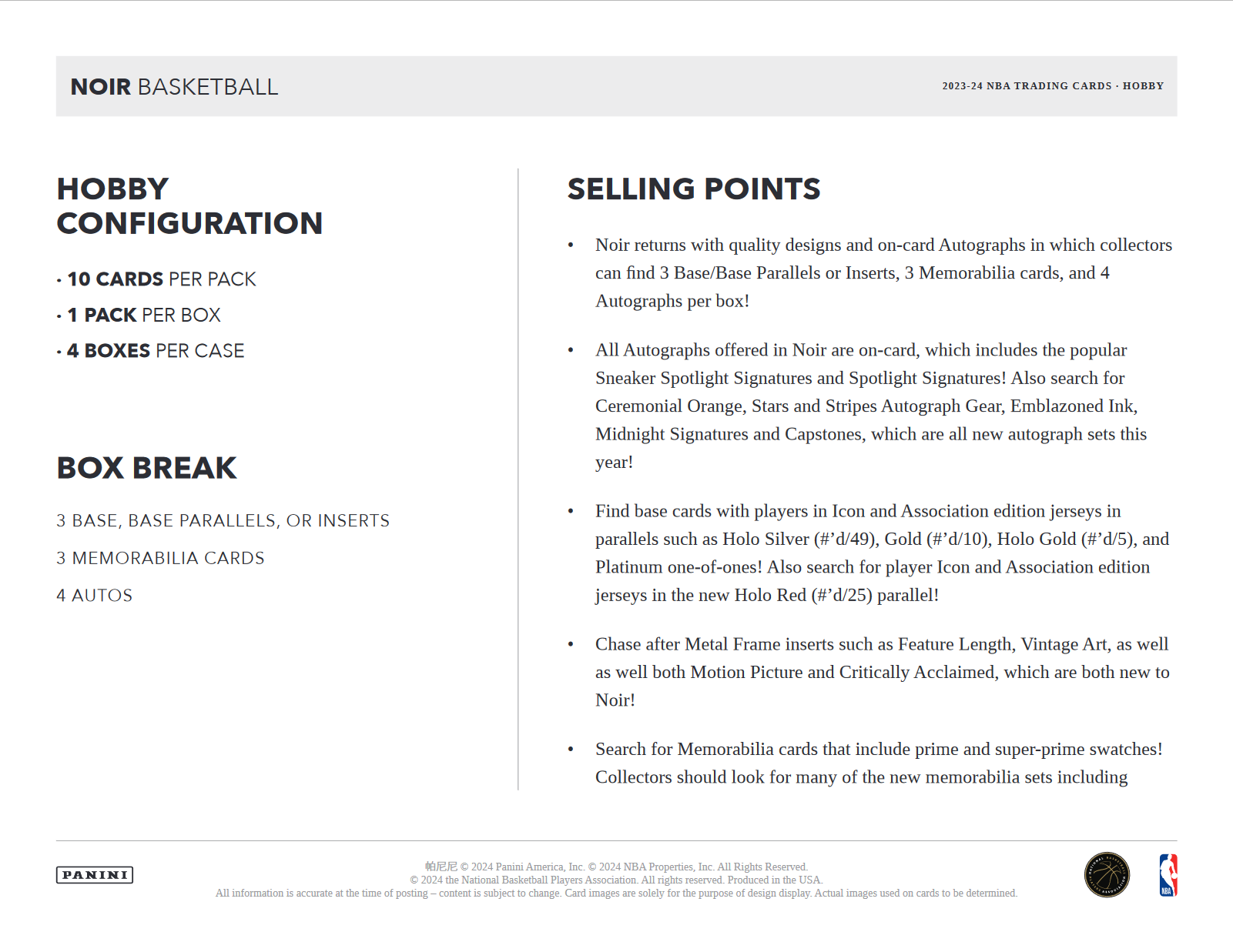 - Noir returns with quality designs and on-card Autographs in which collectors can find 3 Base/Base Parallels or Inserts, 3 Memorabilia cards, and 4 Autographs per box!