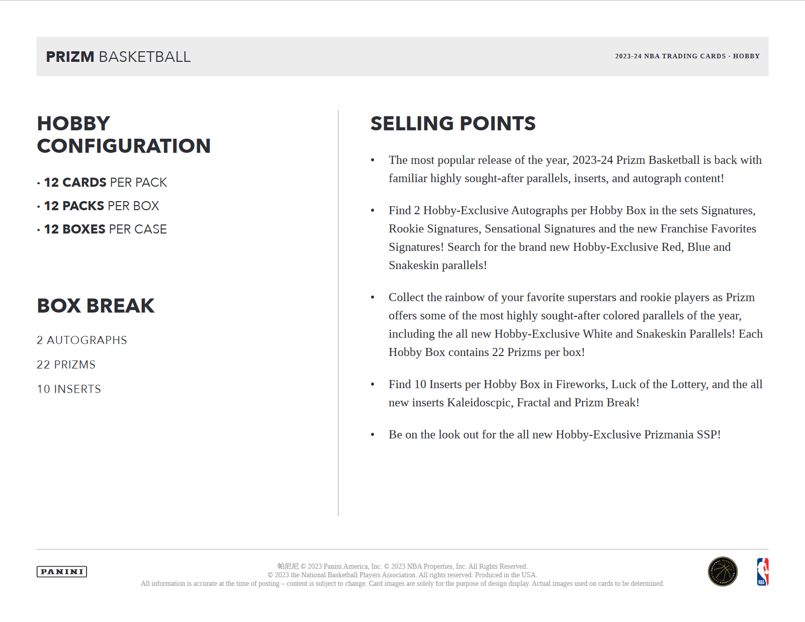 - The most popular release of the year, 2023-24 Prizm Basketball is back with familiar highly sought-after parallels, inserts, and autograph content!