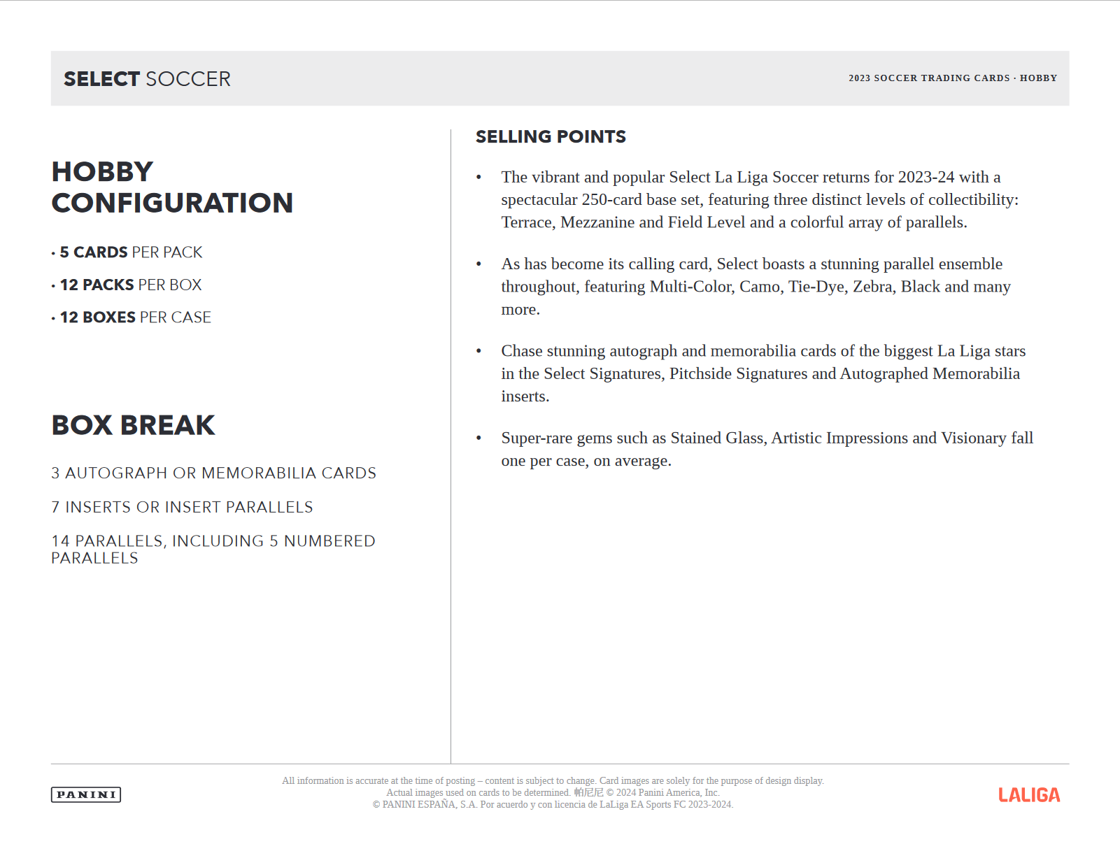 - The vibrant and popular Select La Liga Soccer returns for 2023-24 with a spectacular 250-card base set, featuring three distinct levels of collectability: Terrace, Mezzanine and Field Level and a colorful array of parallels.
