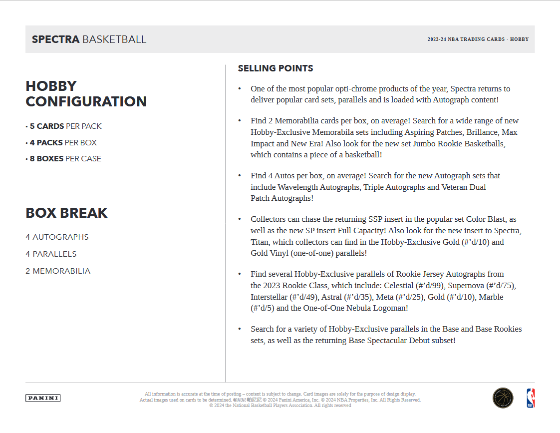 - One of the most popular opti-chrome products of the year, Spectra returns to deliver popular card sets, parallels and is loaded with Autograph content!