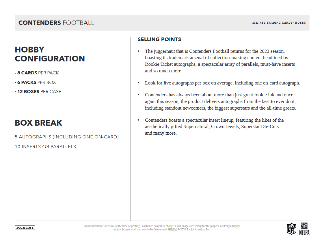 - The juggernaut that is Contenders Football returns for the 2023 season, boasting its trademark arsenal of collection-making content headlined by Rookie Ticket autographs, a spectacular array of parallels, must-have inserts and so much more.