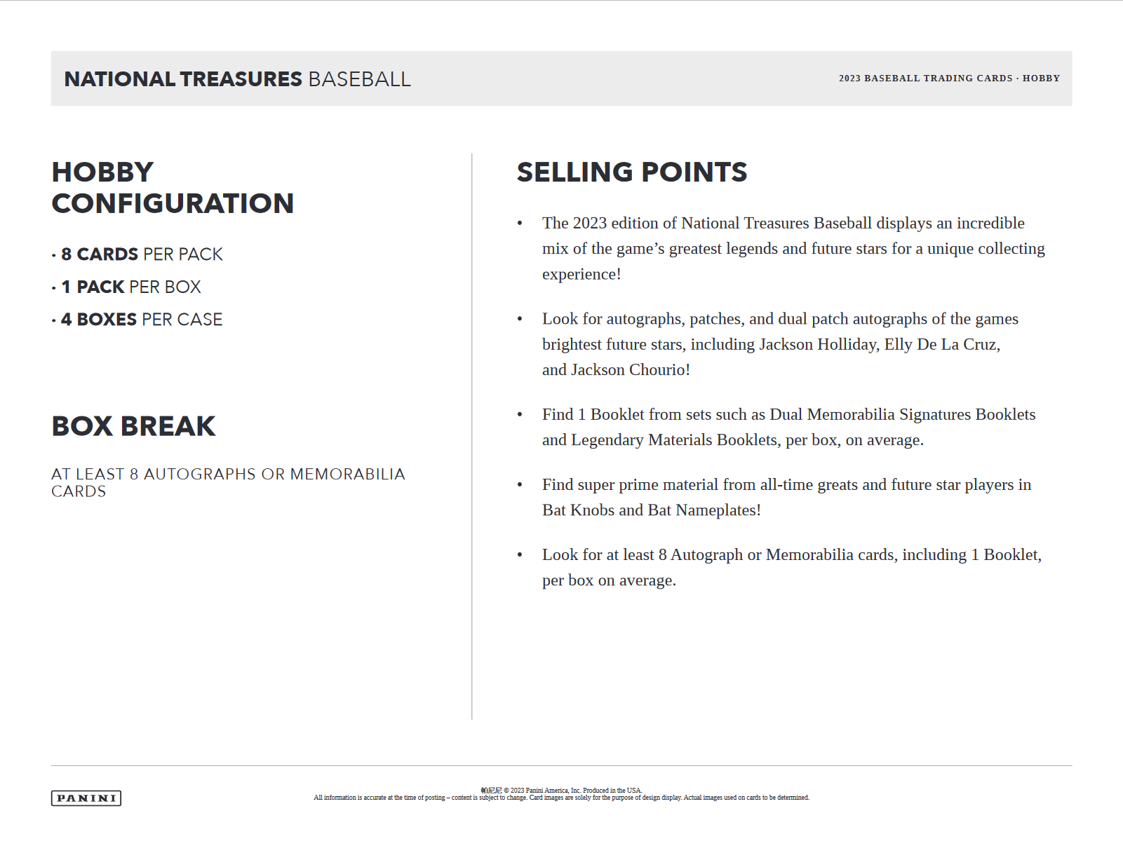 - The 2023 edition of National Treasures Baseball displays an incredible mix of the game’s greatest legends and future stars for a unique collecting experience!