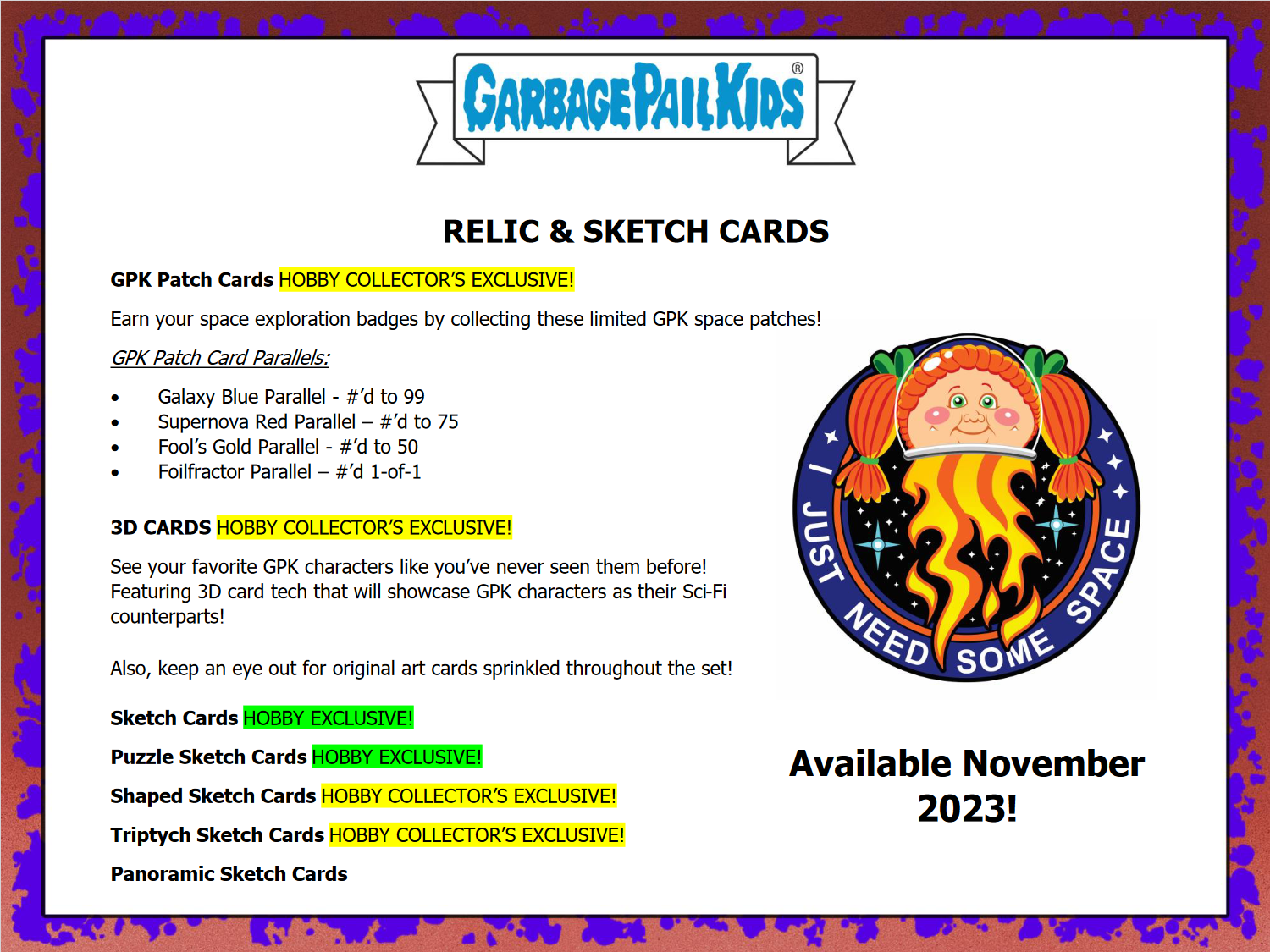 - Stink up your GPK collection with 2023 Garbage Pail Kids: InterGOOlactic Mayhem, featuring some of the grossest, snottiest, craziest gags from Sci-Fi including space travel, aliens and extraterrestrials, parallel universes and more!