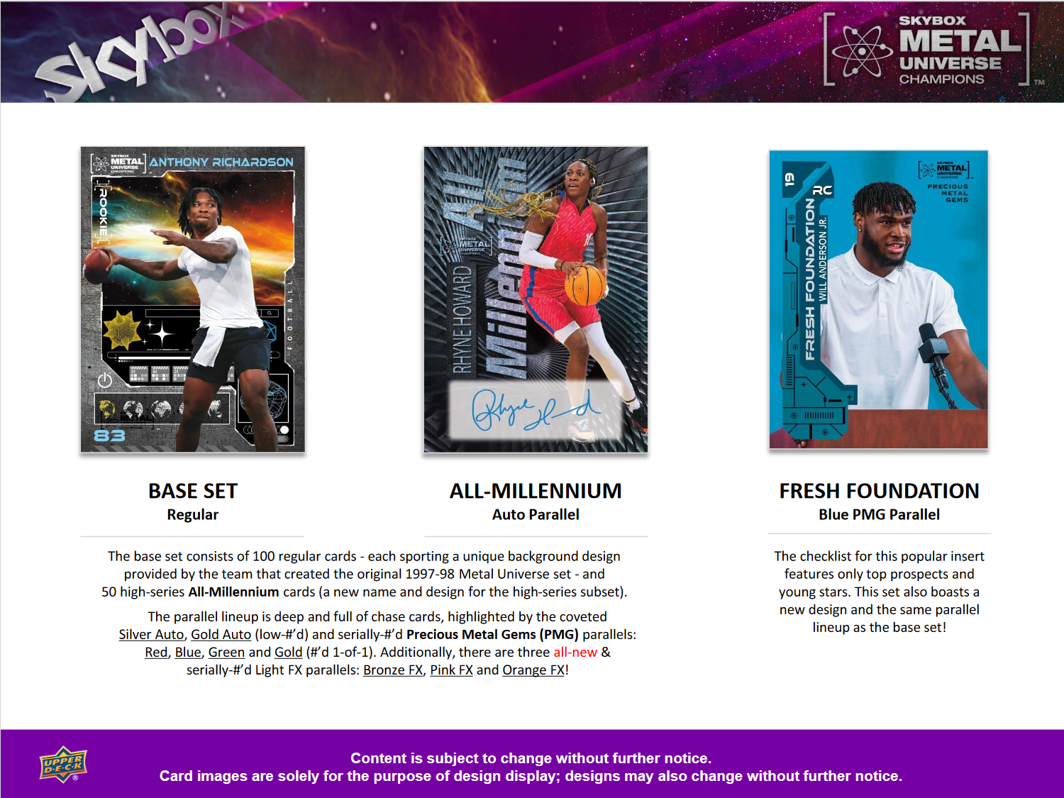 - The base set consists of 100 regular cards - each sporting a unique background design provided by the team that created the original 1997-98 Metal Universe set - and 50 high-series All-Millennium cards (a new name and design for the high-series subset).