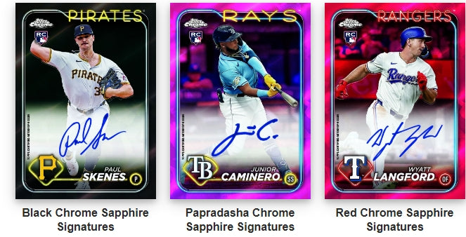 Look out for limited parallels to include Gold, Orange, Black, Red, and Padpardascha Sapphire refractors! Find Superfractor parallels of select players! Find Chrome Sapphire Signatures and Sapphire Selections Signatures of top 2024 Rookies and stars!