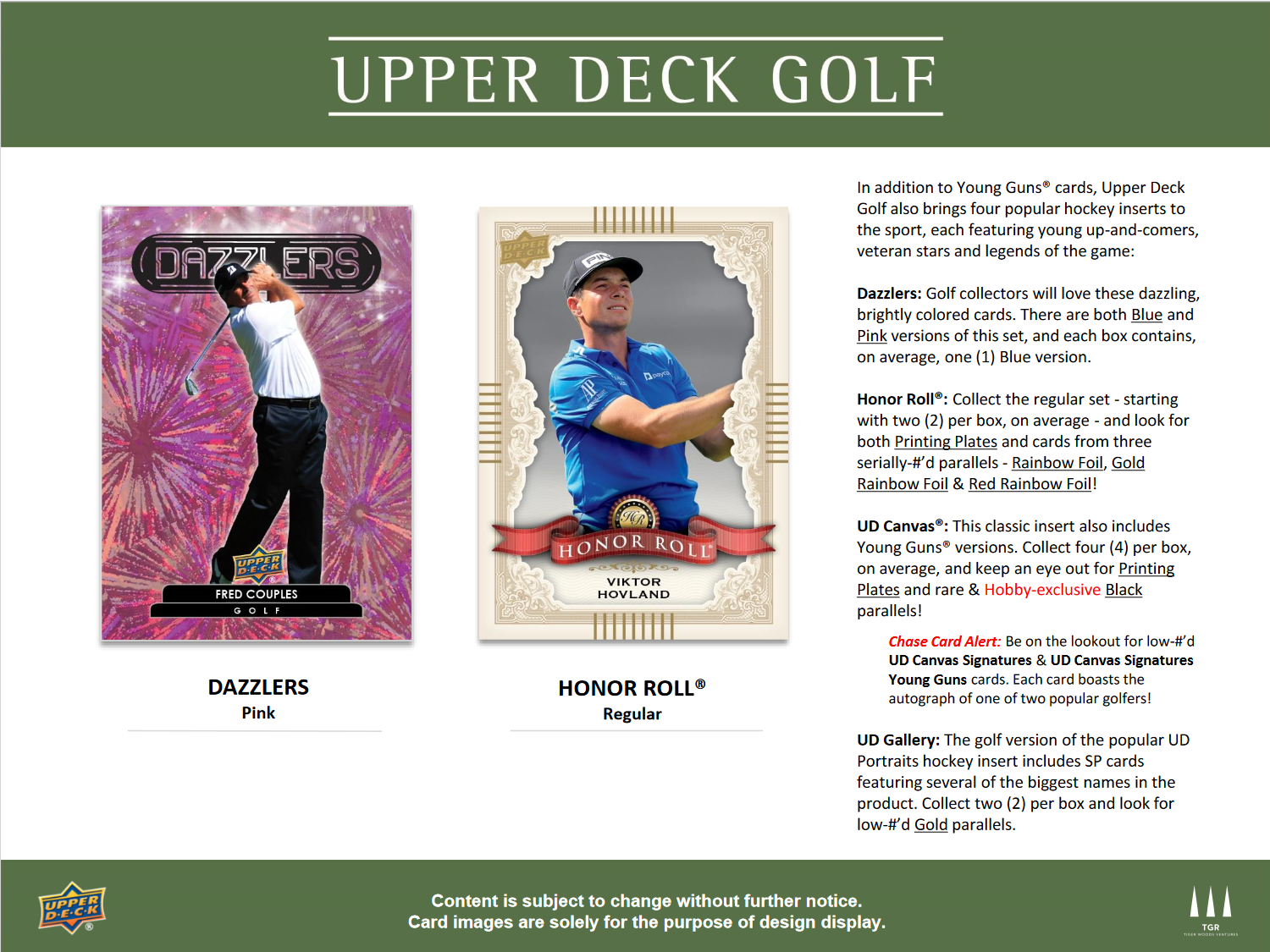- In addition to Young Guns® cards, Upper Deck Golf also brings four popular hockey inserts to the sport, each featuring young up-and-comers, veteran stars and legends of the game: Dazzlers, Honor Roll, UD Canvas, and UD Gallery.