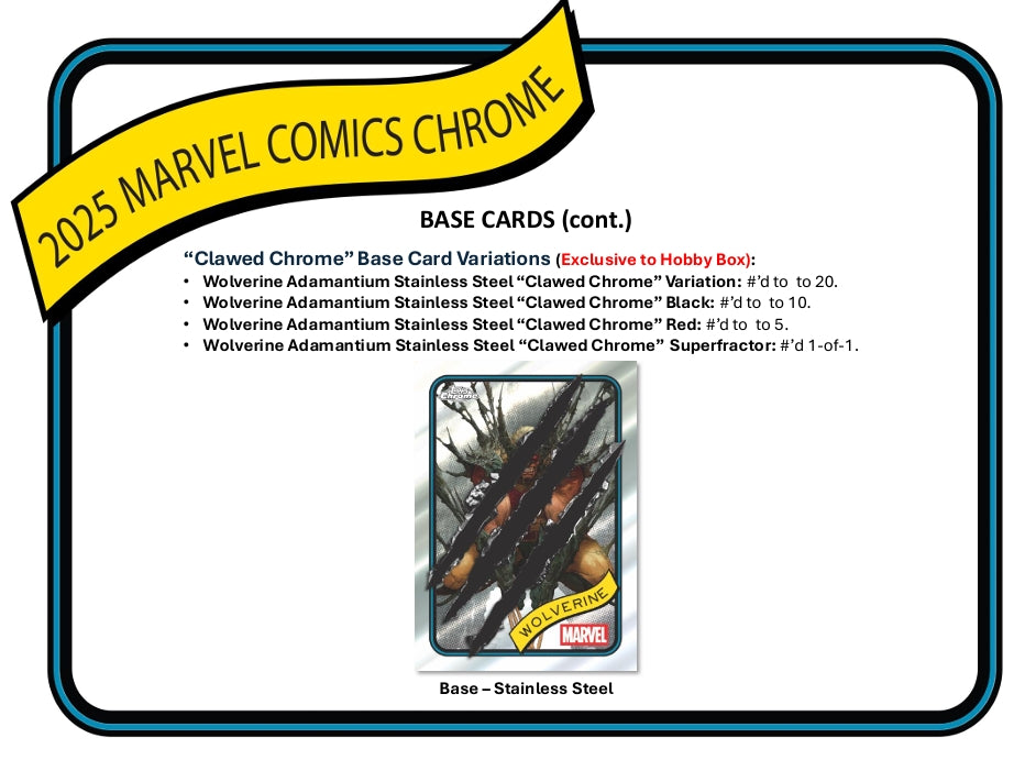 This year’s release features a 200-card base set, spotlighting Marvel’s most iconic characters—from Spider-Man and Iron Man to Hulk and Captain America—alongside 1st Appearance cards for new fan-favorites like Kid Juggernaut and Amaranth. Collectors will also chase the exclusive “Clawed Chrome” base card variations, showcasing Wolverine’s iconic slashes across the card surface.
