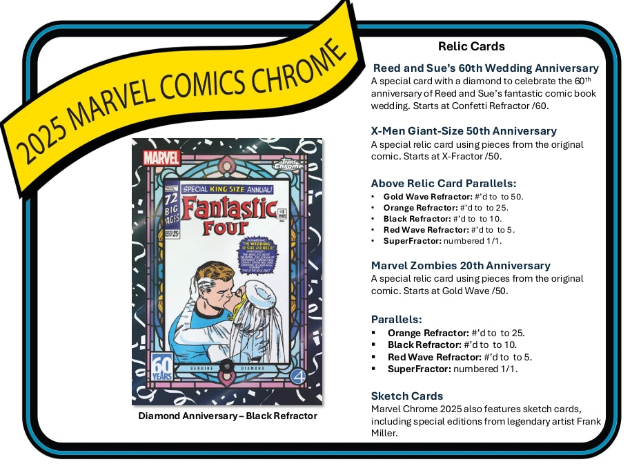 Special chase cards include a confetti refractor diamond card celebrating the 60th anniversary of Reed and Sue’s wedding, a New Avengers 20th anniversary autograph relic with original comic pieces and Steve McNiven autographs, and relic cards commemorating Marvel Zombies and X-Men Giant-Size anniversaries. Look out for rare sketch cards from top-tier Marvel artists.