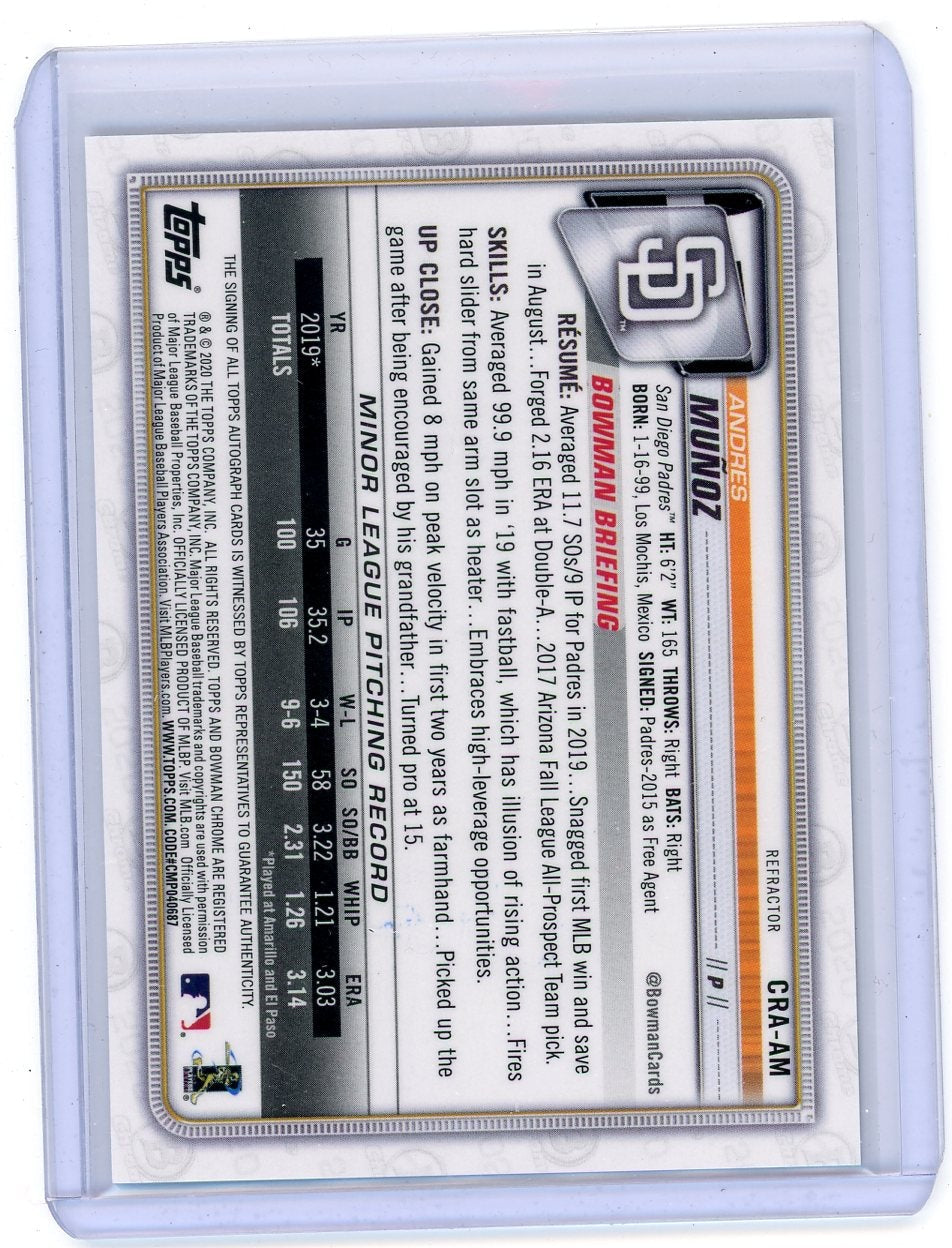 Andres Munoz 2020 Bowman Chrome Refractor Auto RC #'d 325/499