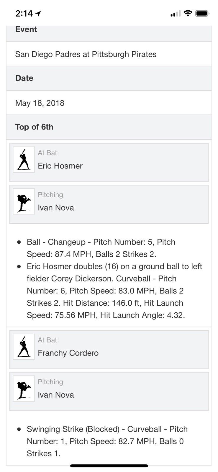 - Eric Hosmer doubles (16) on a ground ball to left fielder Corey Dickerson. Curveball - Pitch Number: 6, Pitch Speed: 83.0 MPH, Balls 2 Strikes 2. Hit Distance: 146.0 ft, Hit Launch Speed: 75.56 MPH, Hit Launch Angle: 4.32.