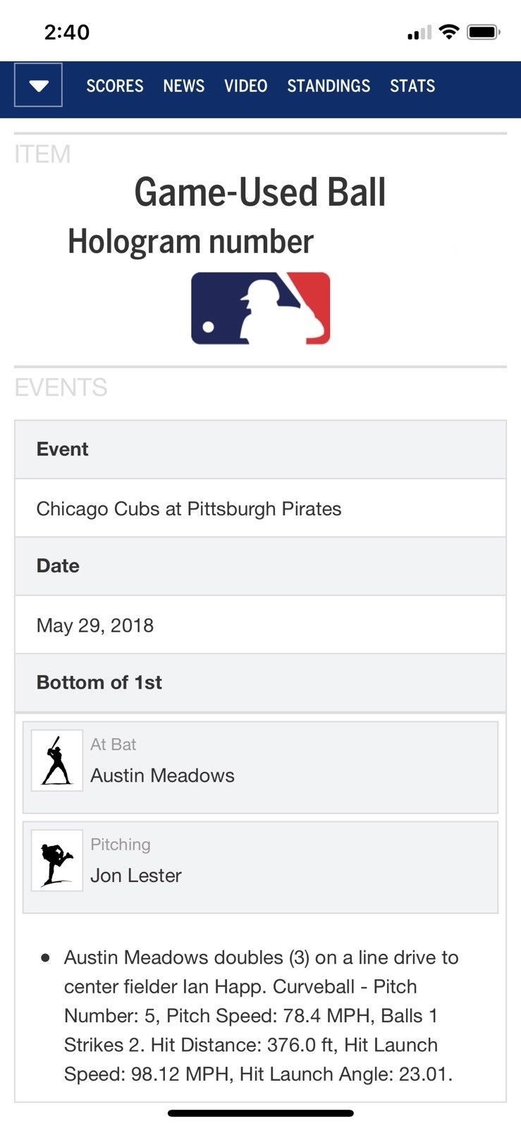 Austin Meadows MLB Game Used Double Autographed Baseball 5/29/18 Career Double#3