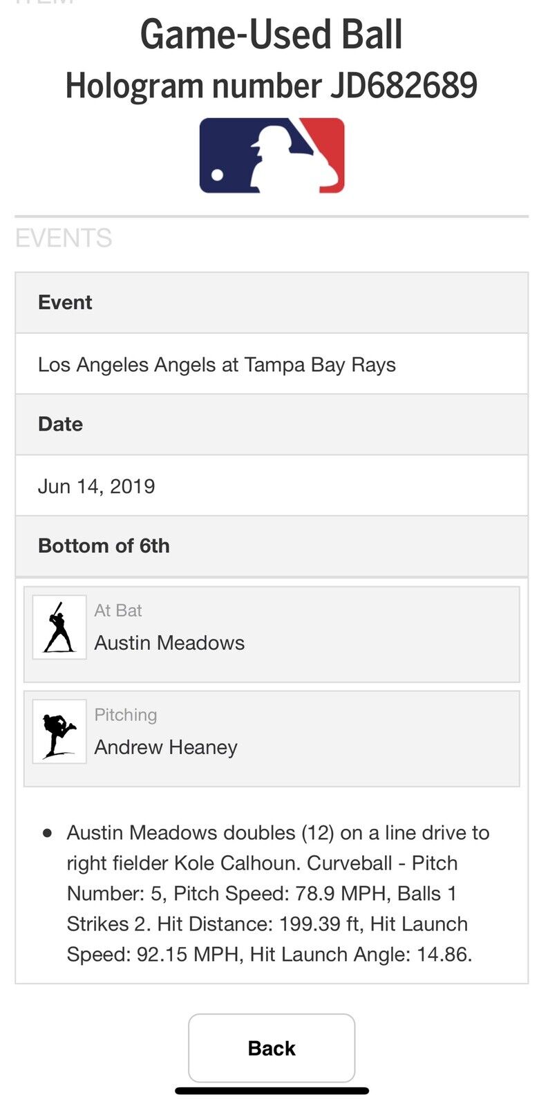 Austin Meadows MLB Game Used Double Baseball 6/14/19 Career Double #24 All Star