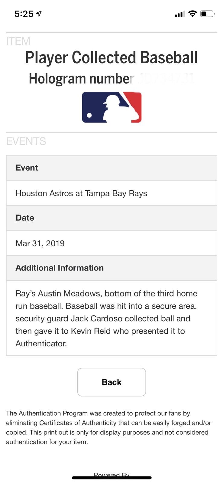 Austin Meadows MLB Game Used Home Run Baseball 3/31/19 Career HR #8 RBI #19-20