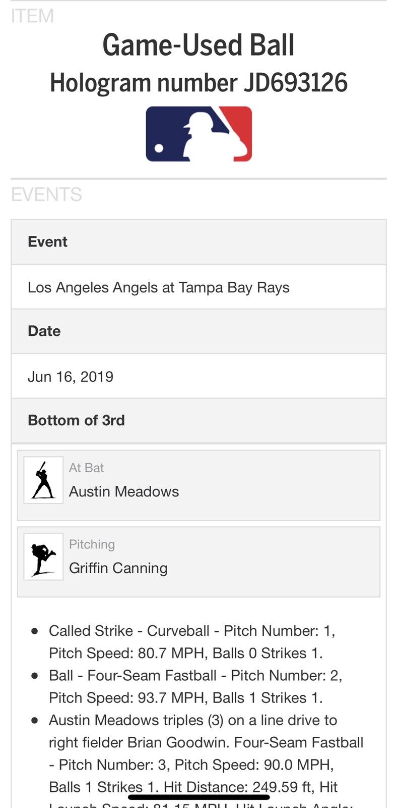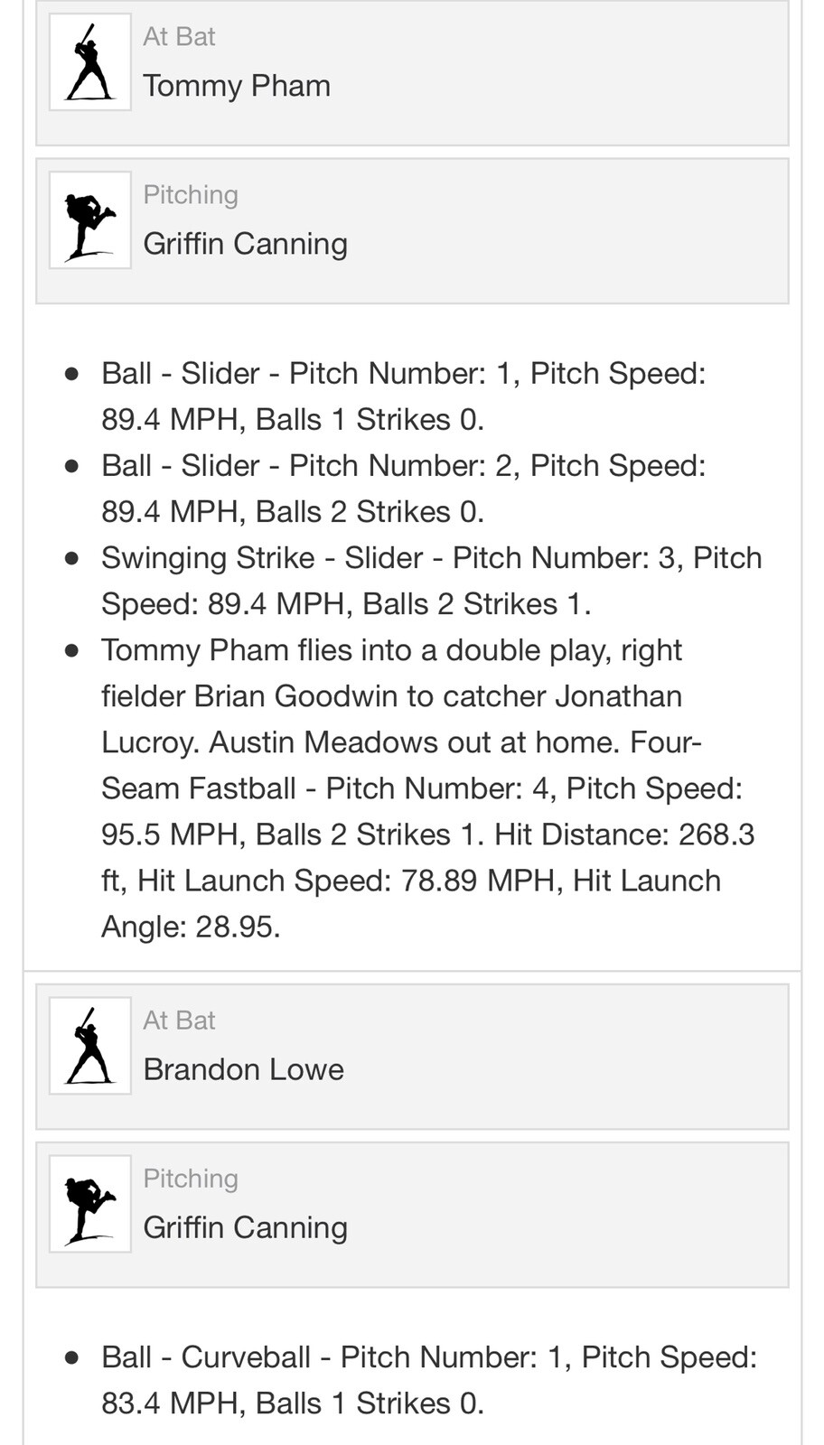 - Austin Meadows triples (3) on a line drive to right fielder Brian Goodwin. Four-Seam Fastball - Pitch Number: 3, Pitch Speed: 90.0 MPH, Balls 1 Strikes 1. Hit Distance: 249.59 ft, Hit Launch Speed: 81.15 MPH, Hit Launch Angle: 21.08.