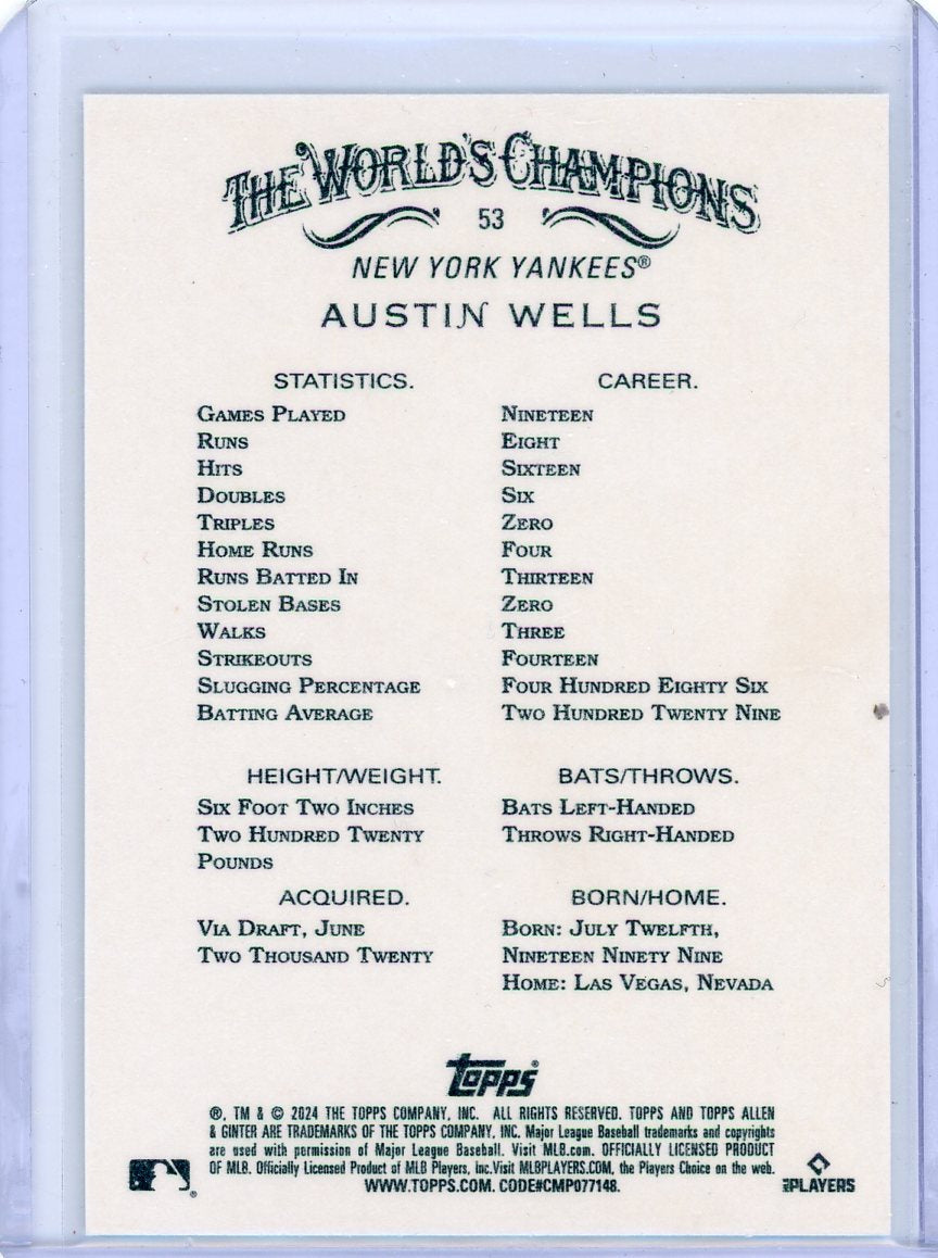 Austin Wells 2024 Topps Allen & Ginter rookie card
