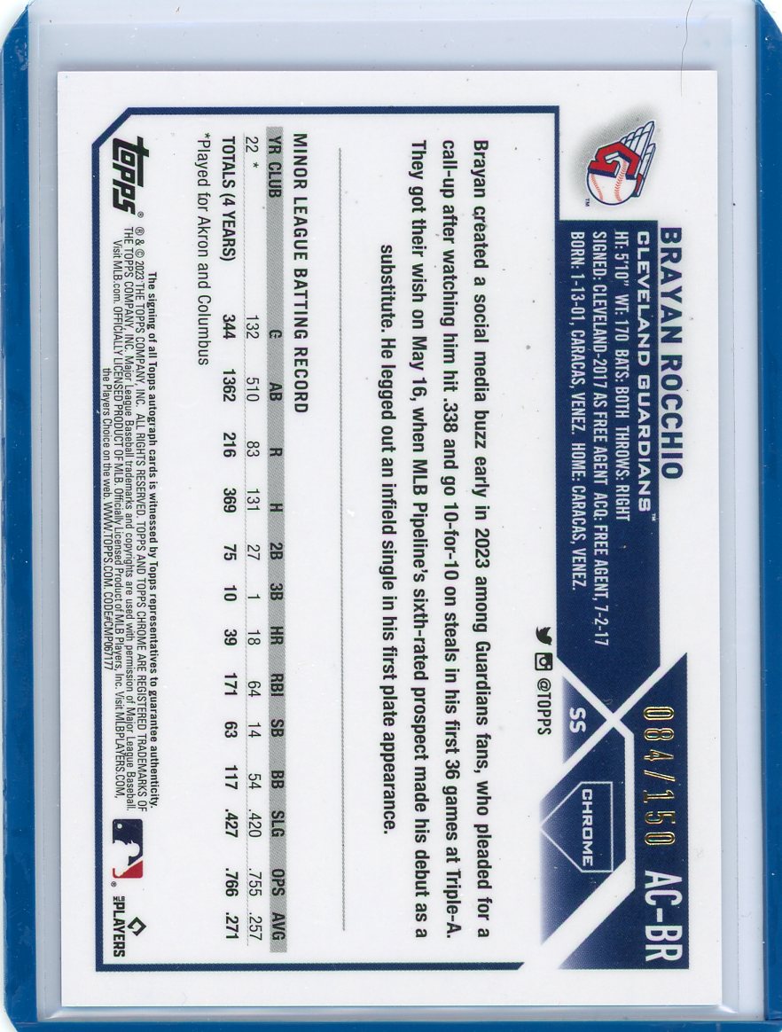 Brayan Rocchio 2023 Topps Chrome autograph rookie card blue ref. #'d 084/150