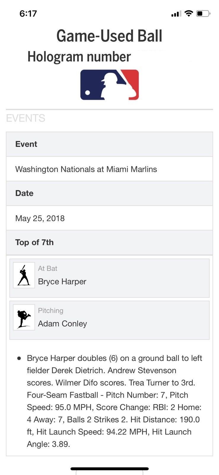 Bryce Harper MLB Game Used Double 2 RBI's 5/25/18 Hit #824 RBI #459+ Double #155