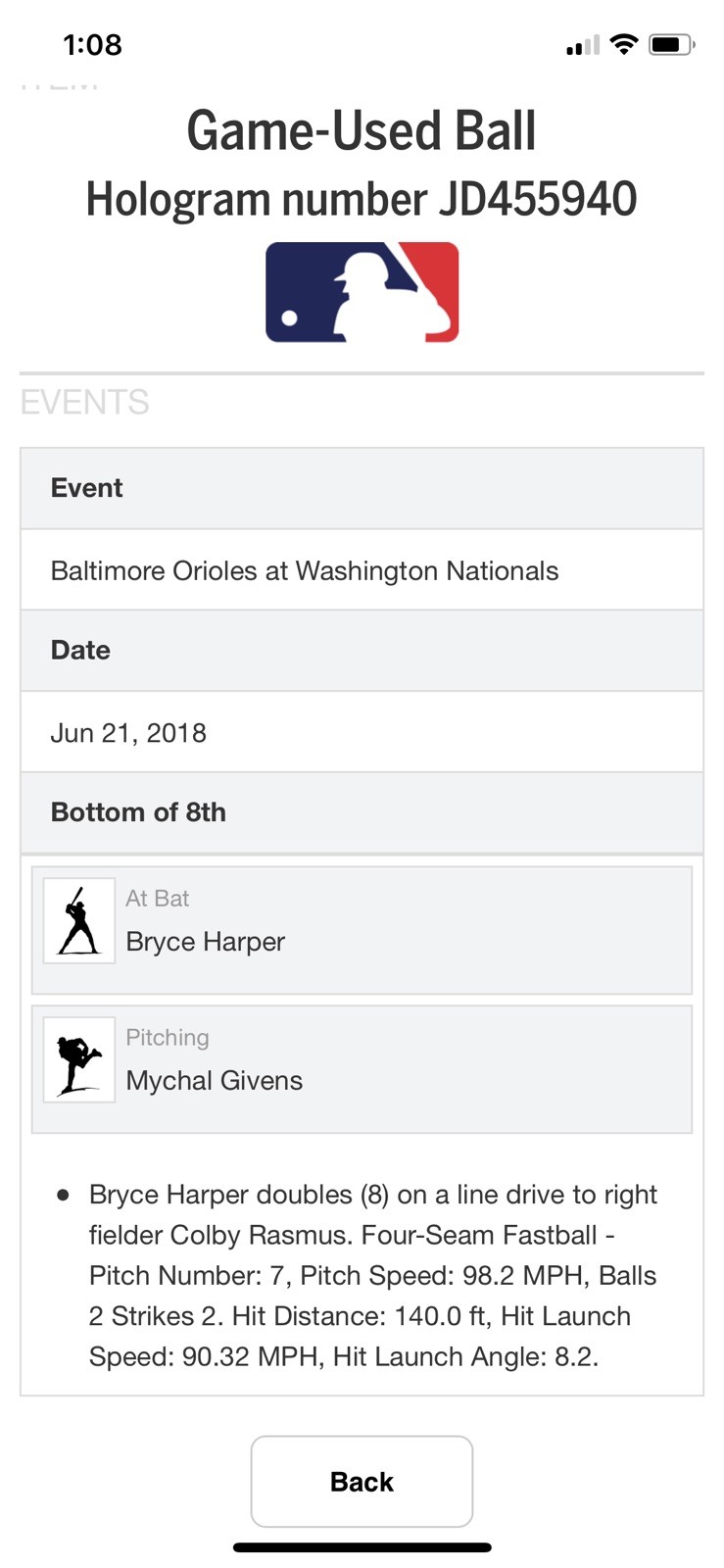 Bryce Harper MLB Game Used Double RBI 6/21/18 Hit #839 RBI #466 Double #157