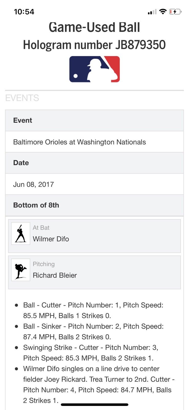 Bryce Harper MLB Game Used Single 6/8/17 Hit #713 Dual Single Ball Wilmer Difo