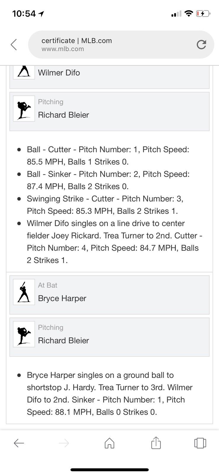 Bryce Harper singles on a ground ball to shortstop J. Hardy. Trea Turner to 3rd. Wilmer Difo to 2nd. Sinker - Pitch Number: 1, Pitch Speed: 88.1 MPH, Balls 0 Strikes 0.