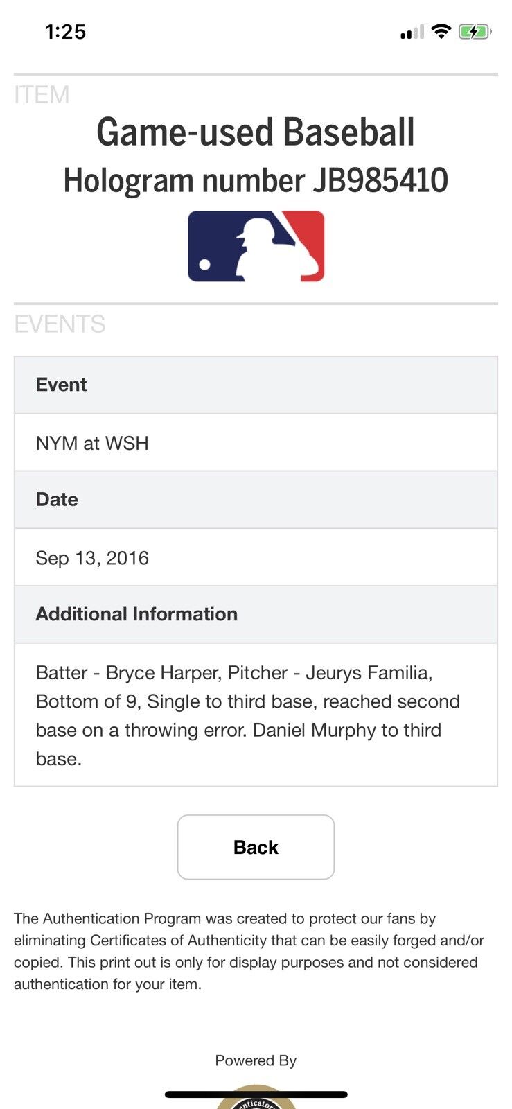 Bryce Harper MLB Game Used Single 9/13/16 Hit #630 Mets vs Nationals