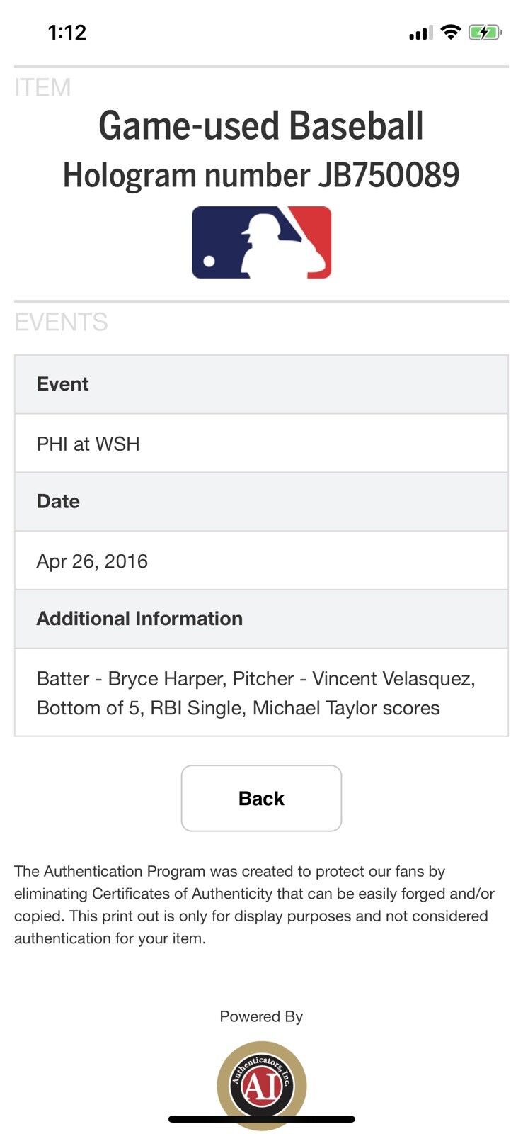 Bryce Harper MLB Game Used Single RBI 4/26/16 Hit #549 Phillies vs Nationals