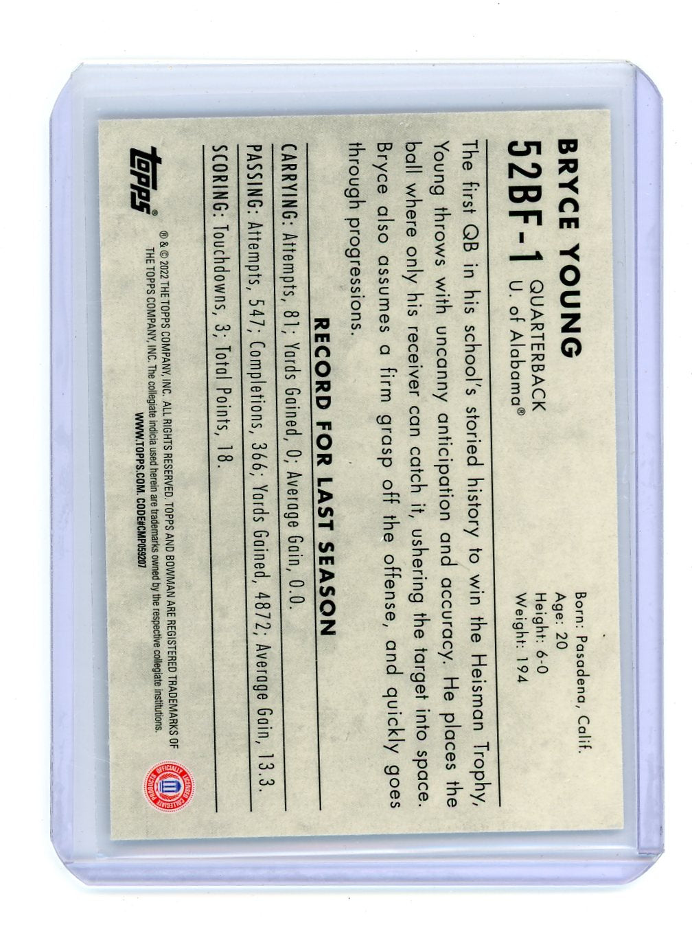 Bryce Young 2022 Bowman Chrome University '52 insert