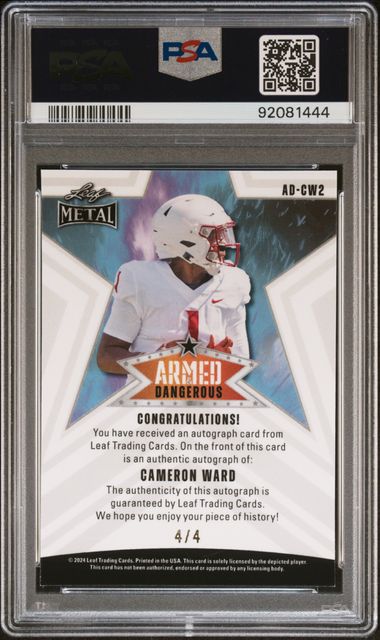 Cameron Ward 2024 Leaf Metal Armed & Dangerous Auto Blue Pulsar #'d 4/4 PSA 10
