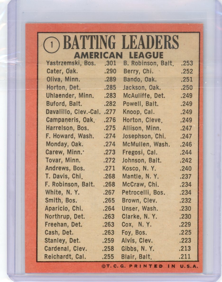 Carl Yastrzemski/Tony Oliva/D. Cater 1968 Batting Leaders 1969 Topps #1