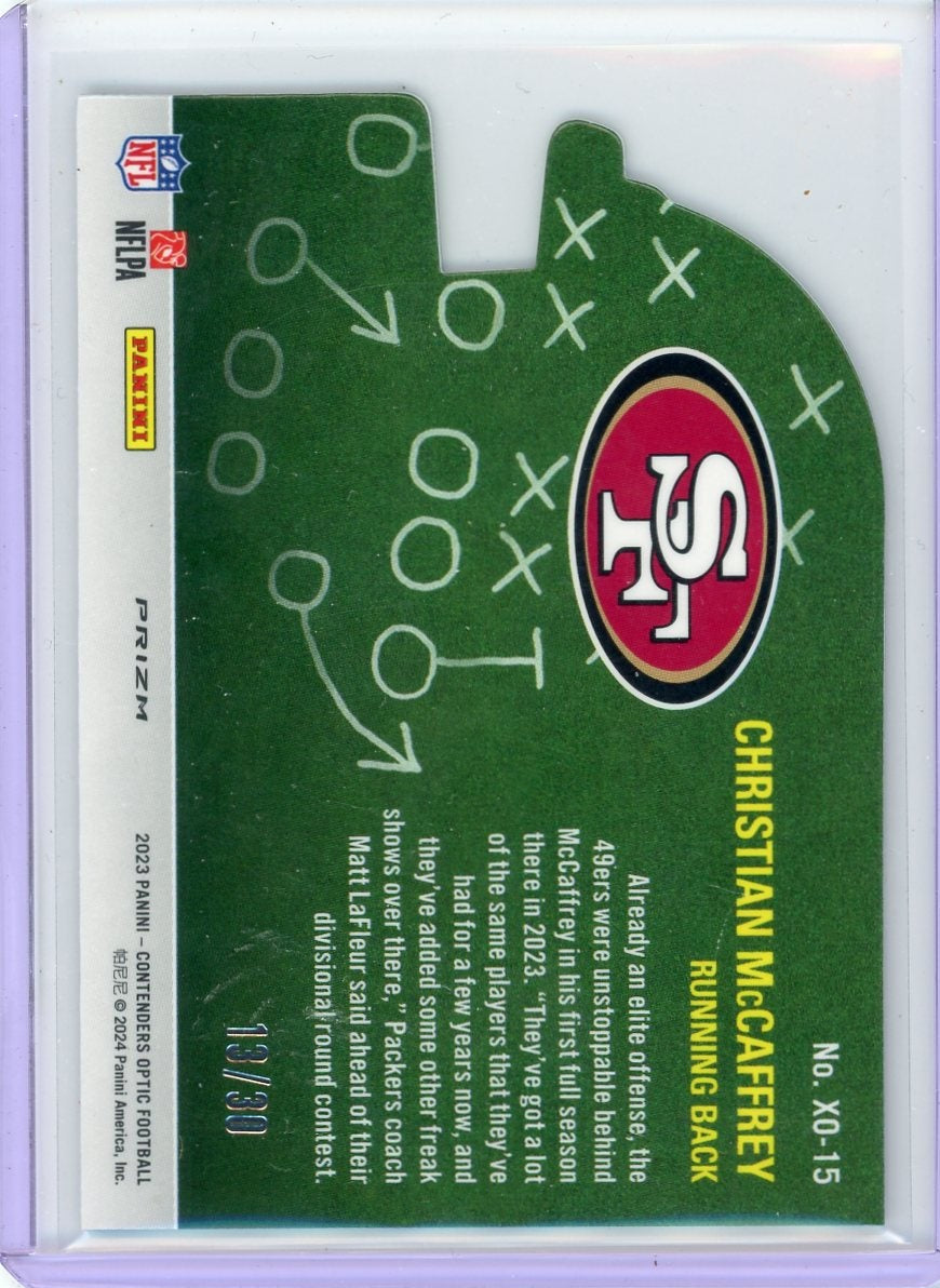 Christian McCaffrey 2023 Panini Contenders Optic X's & O's green pulsar prizm die-cut #'d 13/30