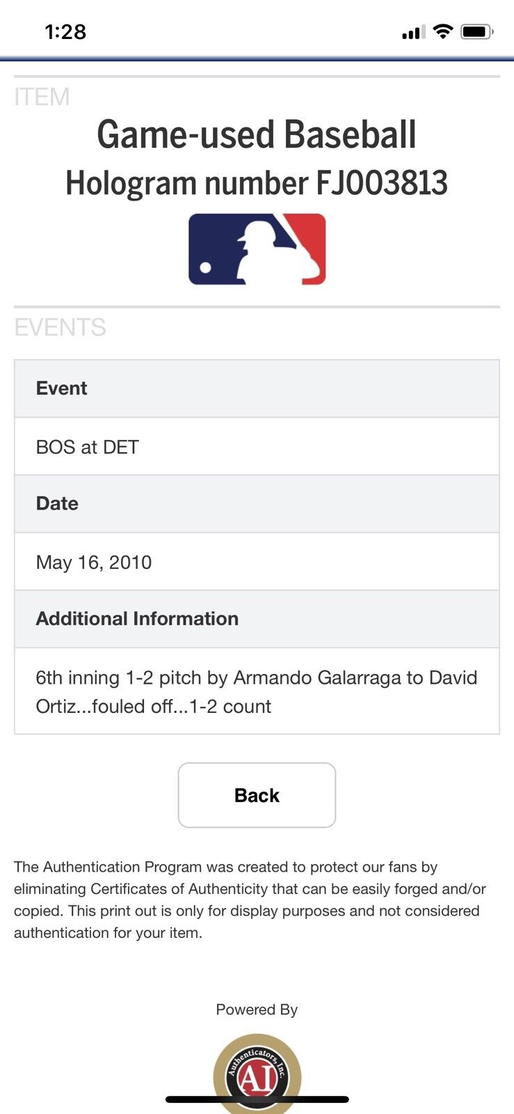 David Ortiz MLB Game Used Autographed Ball 5/16/10 Boston vs Detroit