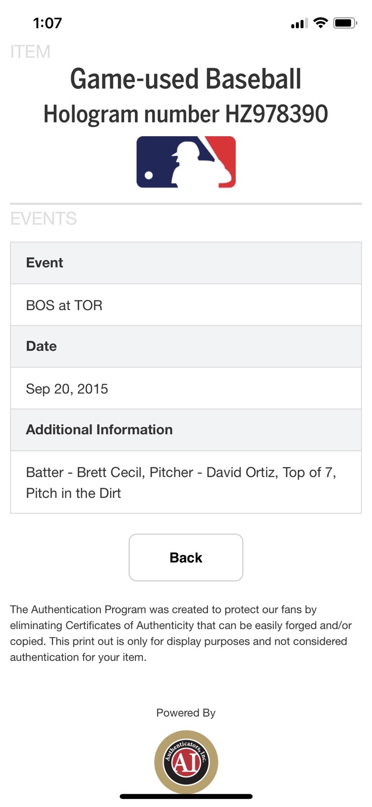 David Ortiz MLB Game Used Autographed Ball 9/20/15 Boston vs Toronto