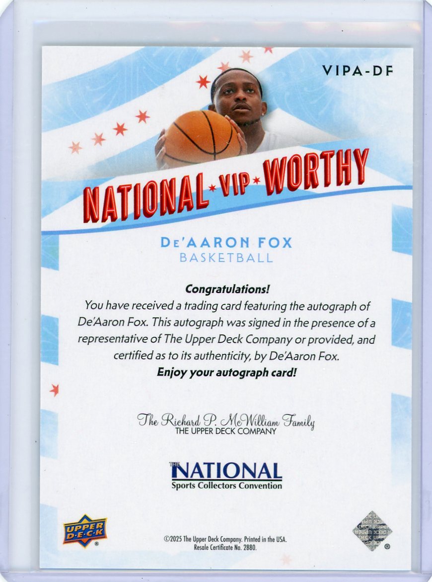 De'Aaron Fox 2025 Upper Deck NSCC VIP Worthy autograph #'d 03/15