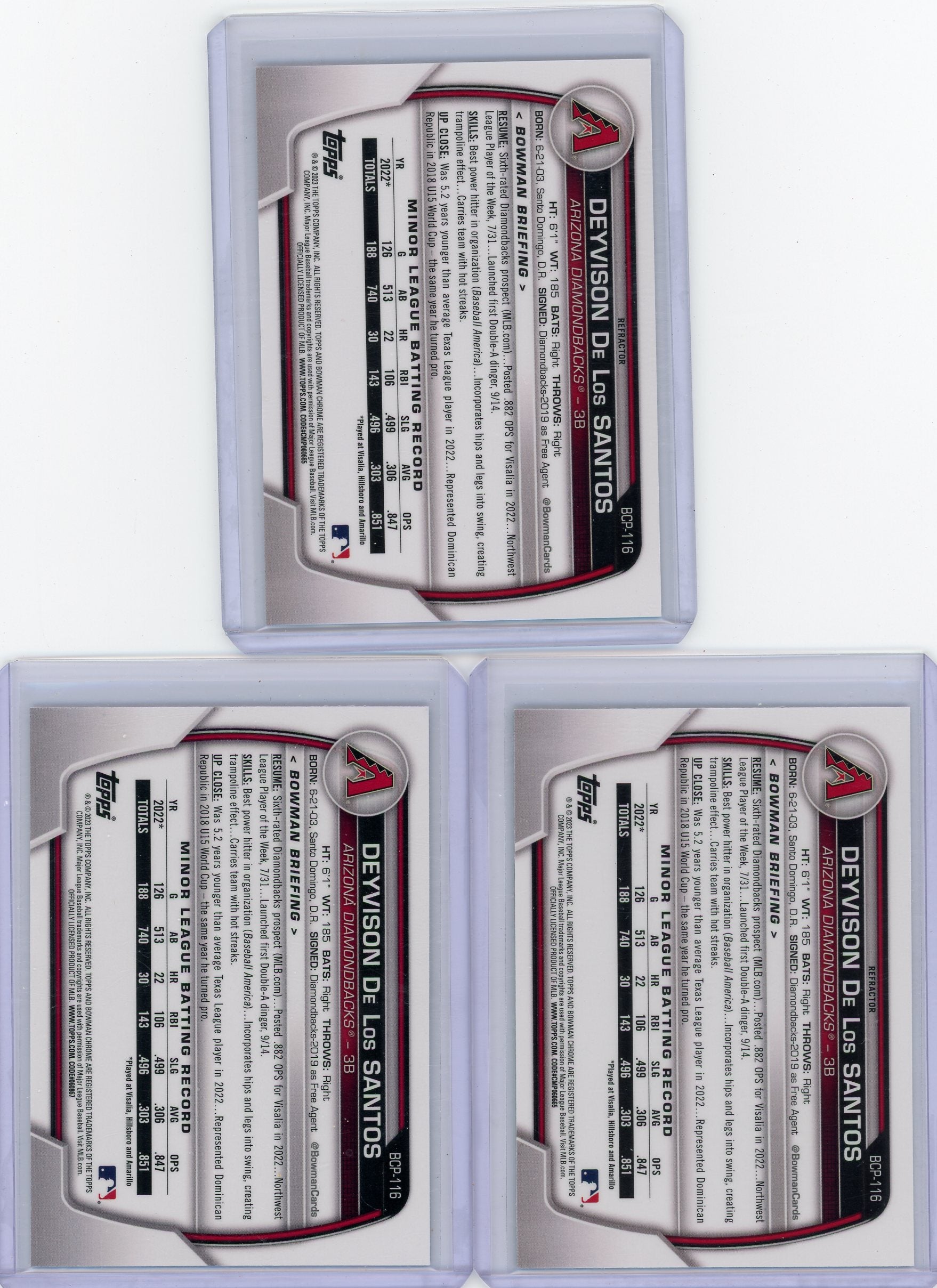 Deyvison De Los Santos 2023 1st Bowman Chrome refractor /499, mojo + green lunar 3-card lot
