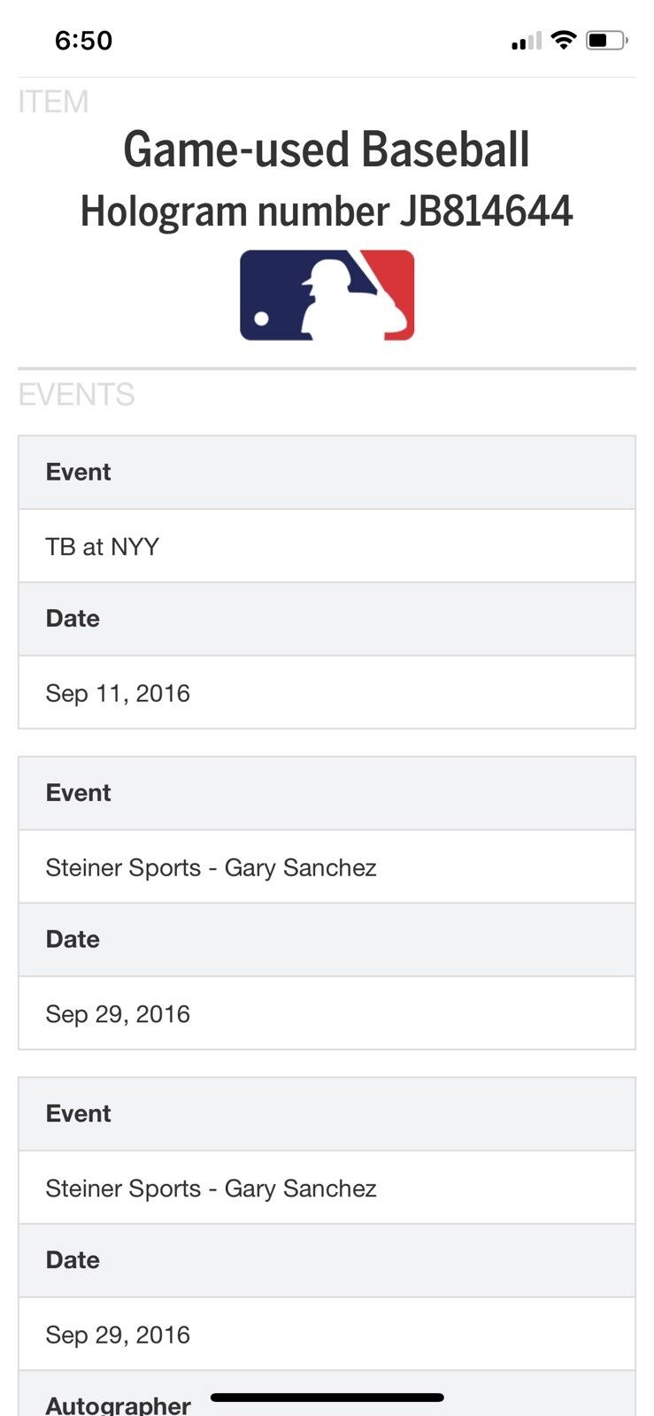 Gary Sanchez Game Used Baseball Rookie Year Autographed Baseball 9/11/16