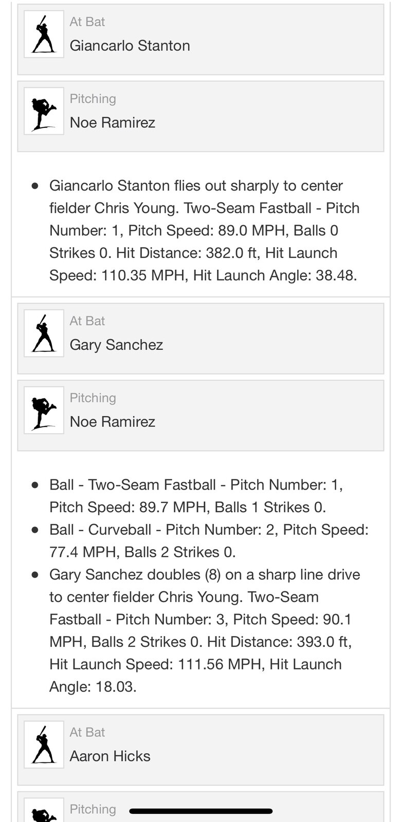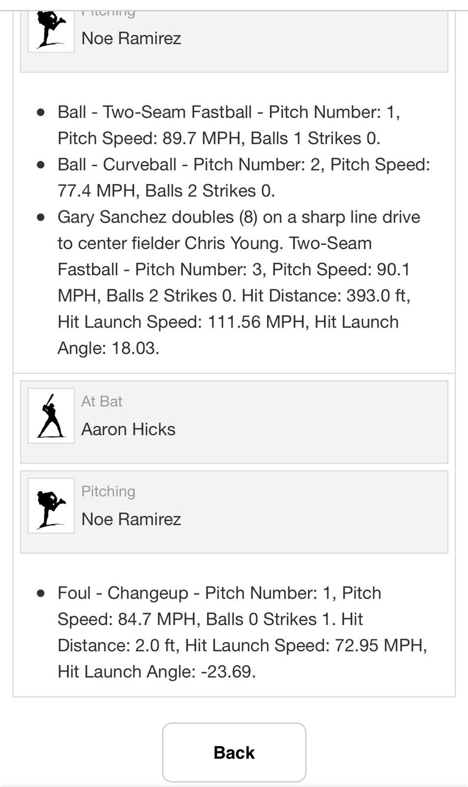 - Gary Sanchez doubles (8) on a sharp line drive to center fielder Chris Young. Two-Seam Fastball - Pitch Number: 3, Pitch Speed: 90.1 MPH, Balls 2 Strikes 0. Hit Distance: 393.0 ft, Hit Launch Speed: 111.56 MPH, Hit Launch Angle: 18.03.