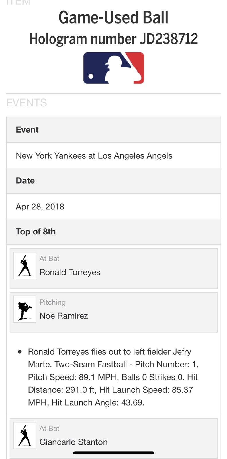 Gary Sanchez Game Used MLB Authenticated Double Autographed Baseball 4/28/18