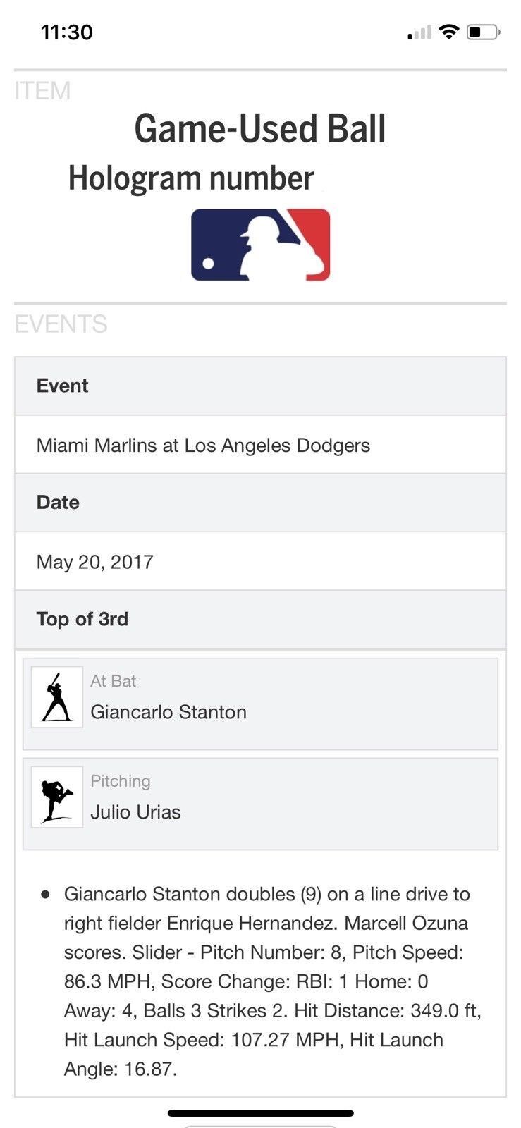 Giancarlo Stanton MLB Game Used Double RBI 5/20/17 Hit # 833 RBI # 568 MVP Year!