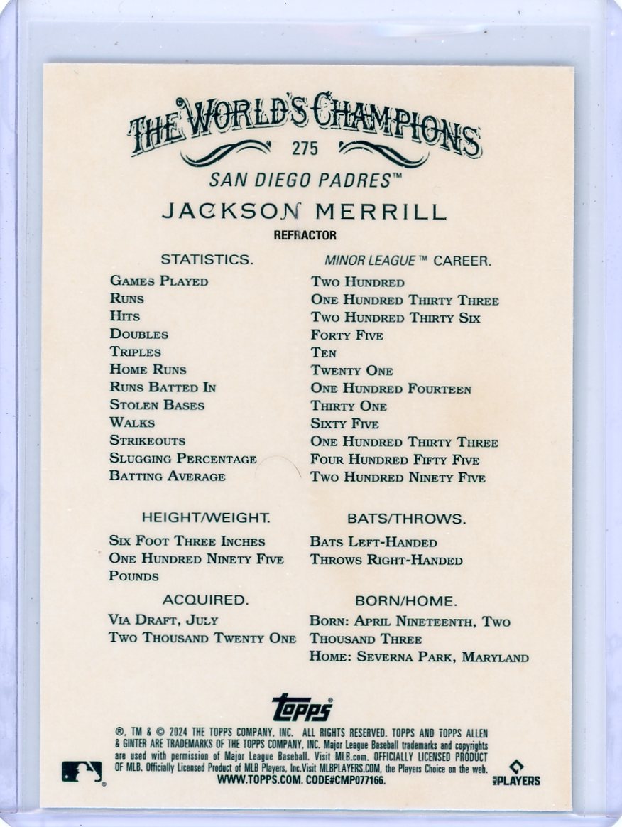Jackson Merrill 2024 Topps Allen & Ginter Chrome refractor rookie card