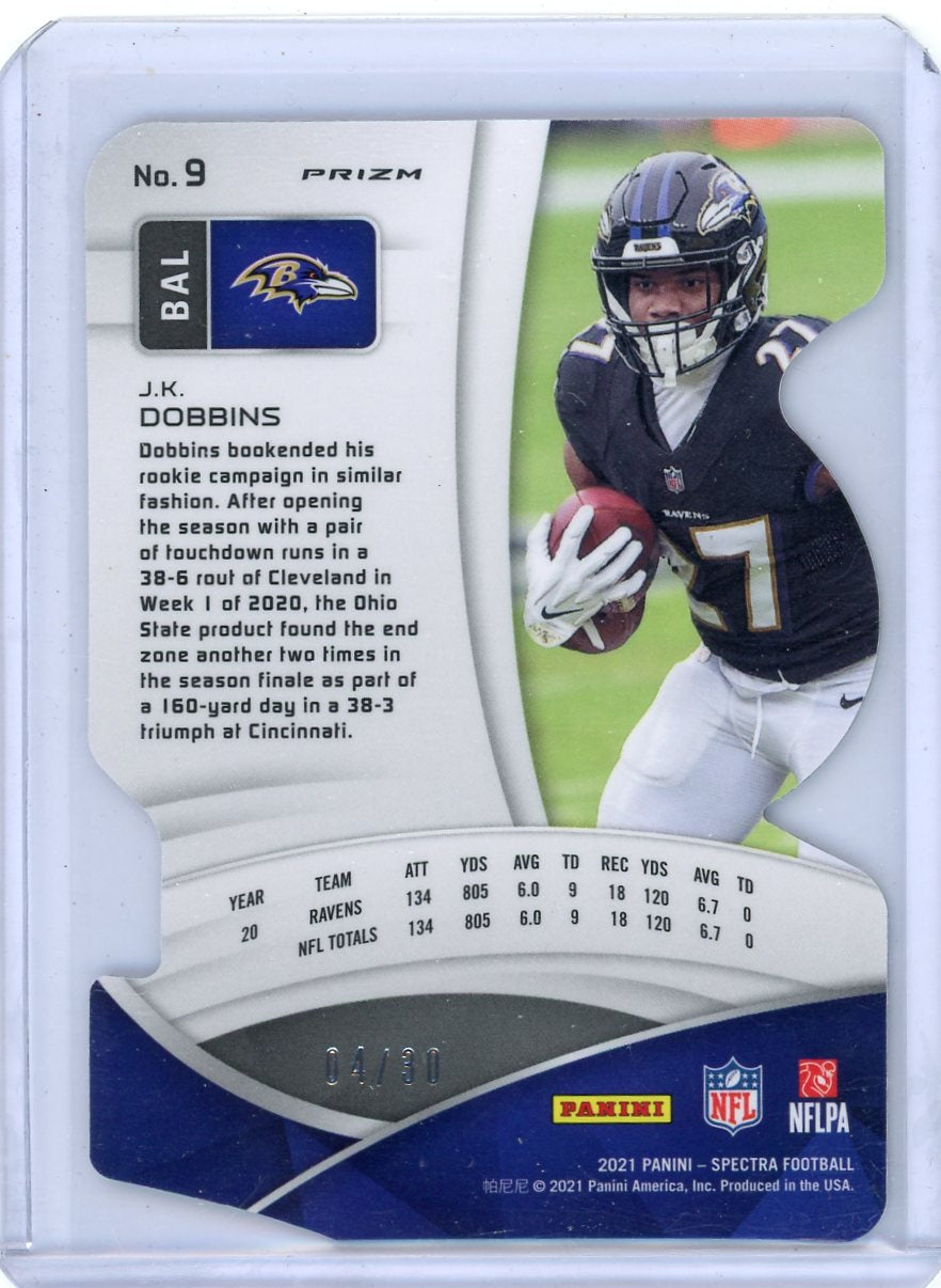 JK Dobbins 2021 Panini Spectra die-cut green prizm #'d 04/30