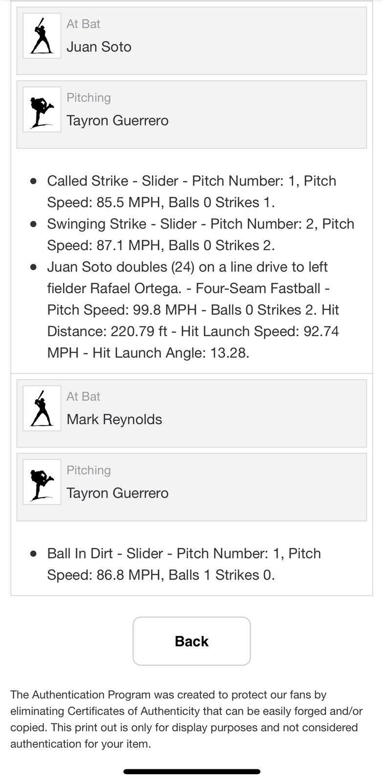- Juan Soto doubles (24) on a line drive to left fielder Rafael Ortega. - Four-Seam Fastball - Pitch Speed: 99.8 MPH - Balls 0 Strikes 2. Hit Distance: 220.79 ft - Hit Launch Speed: 92.74 MPH - Hit Launch Angle: 13.28.